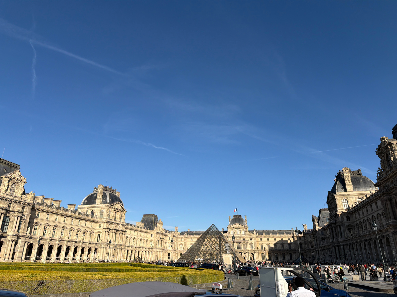 The image depicts the Louvre Museum in Paris, France, under a clear blue sky with two visible contrails. The iconic glass pyramid is centrally located in the frame. The museum's architecture is promin…read more