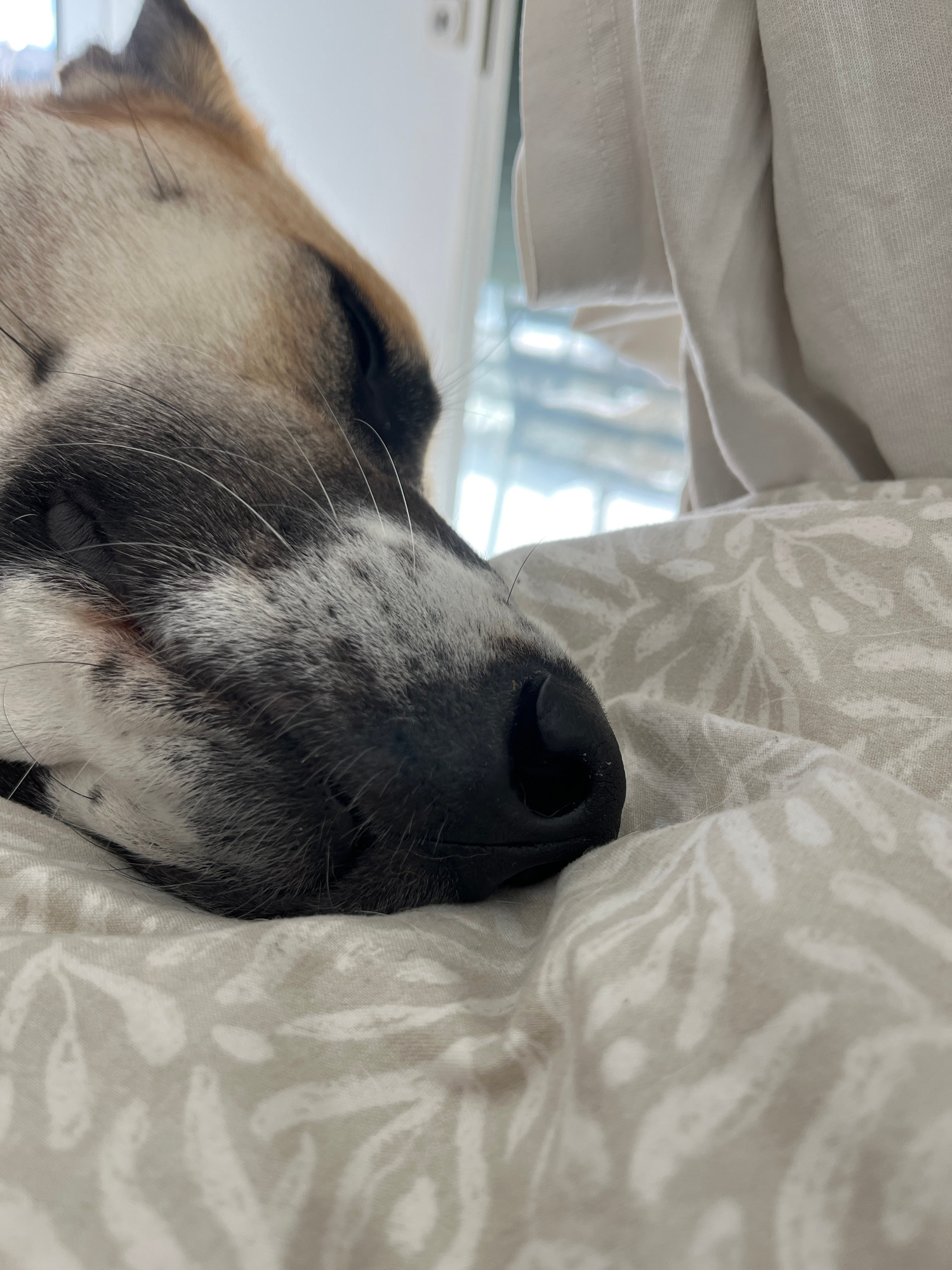 A close-up shot shows a dog sleeping under bedding. The dog has a black nose with grey and white fur around it. The bedding is off-white with a leaf pattern. There are no people visible. The environme…read more