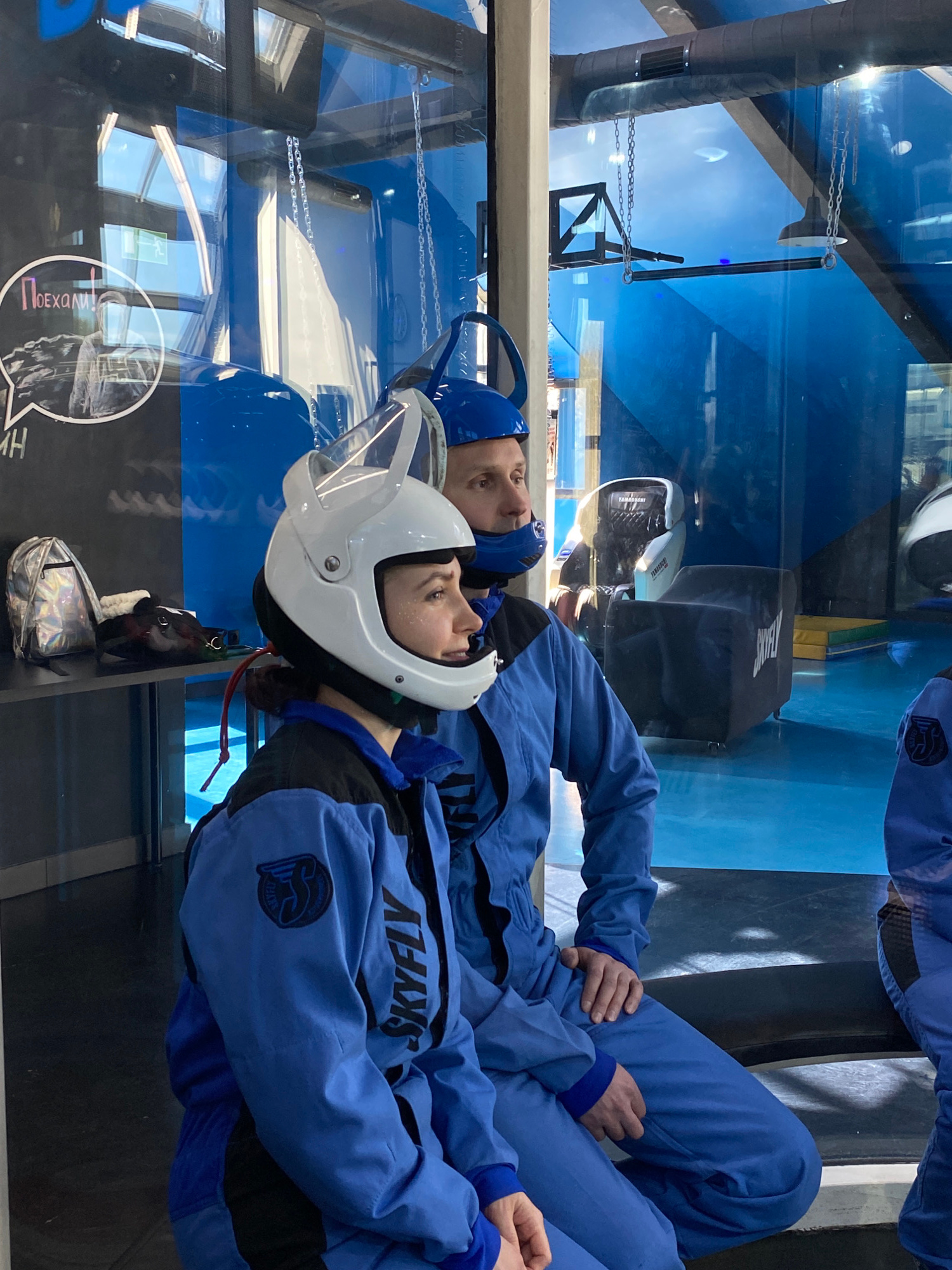Two people in blue skydiving suits and helmets are preparing for an indoor skydiving experience at the Aerotruba FlyStation in Izhevsk, Russia. The individuals are wearing full-face helmets, and one i…read more
