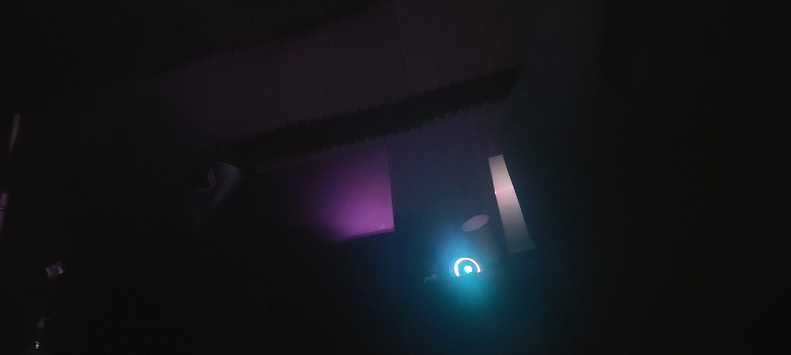The image depicts a dimly lit interior, possibly a room. There is a circular light source emitting a blueish-green glow on the upper left, suggesting an electronic device or a small lamp. Adjacent to…read more
