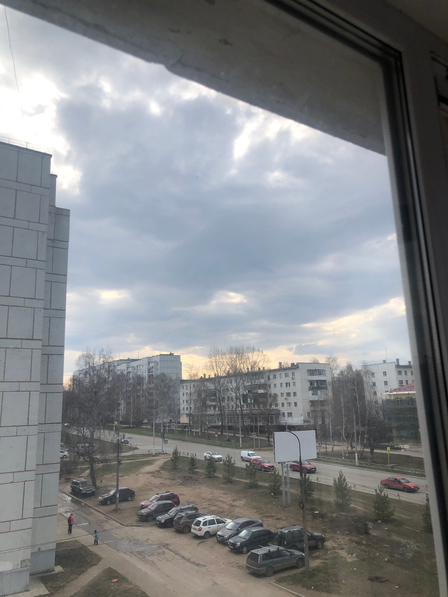 The image is taken from an elevated position, likely an apartment window, overlooking a residential area in the city of Chaikovsky, Russia. The scene is dominated by multi-story residential buildings…read more