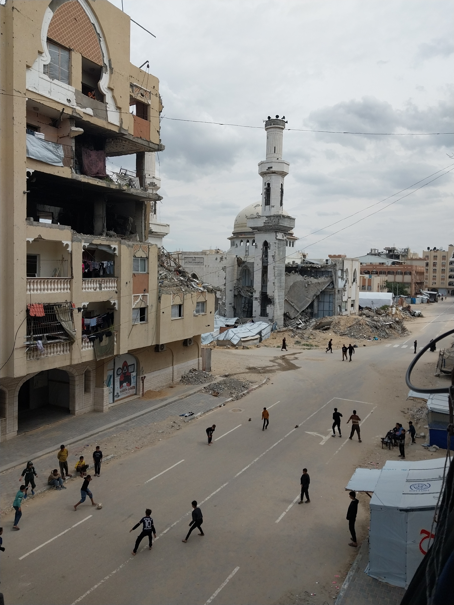 This image captures a wide street scene in Khan Yunis, Palestinian Territory, under an overcast sky. The foreground and midground feature a paved road with white lane markings. To the left, a multi-sā¦read more