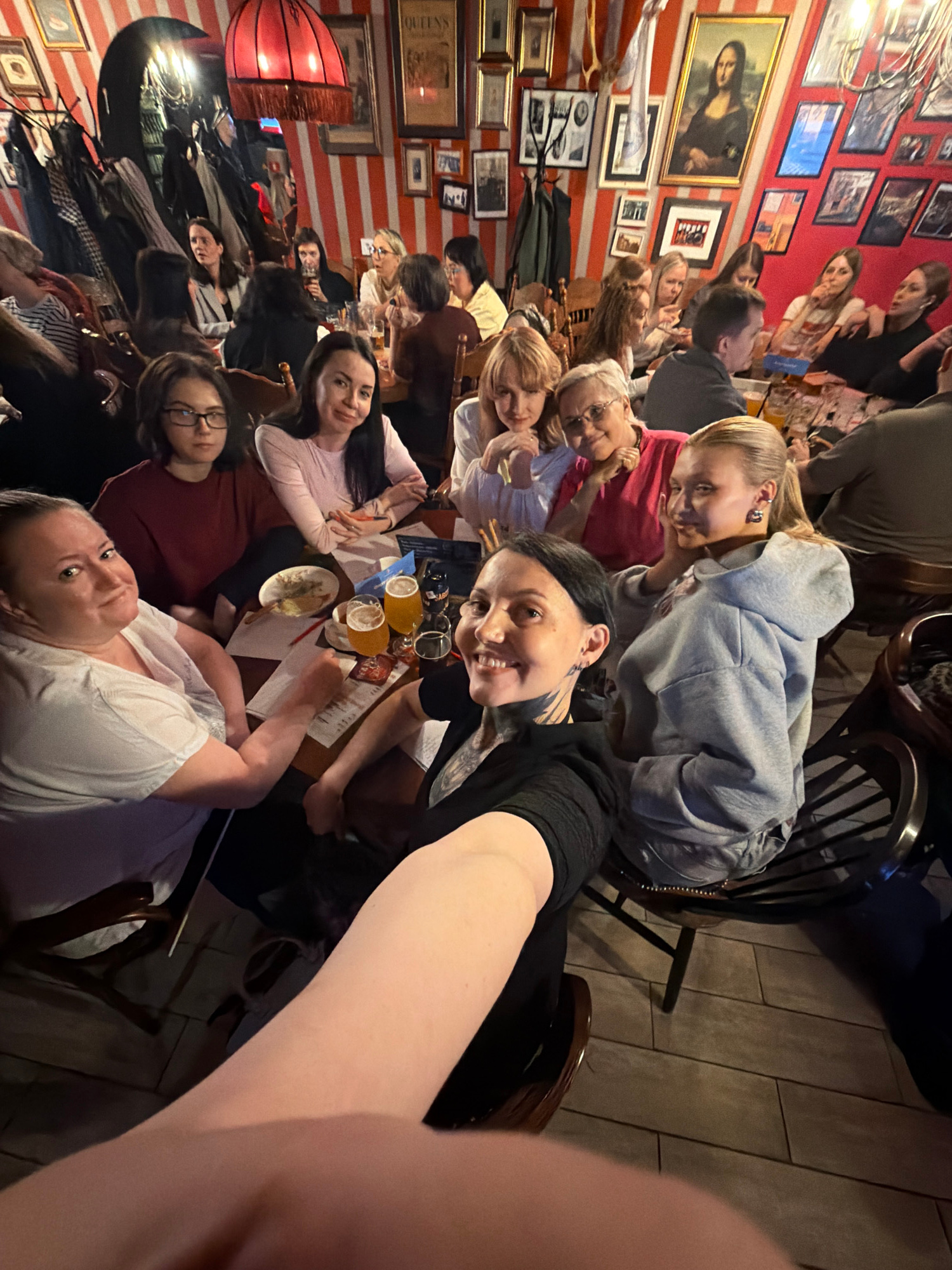 A group of approximately 15 people are seated at a long table in a room with red and white striped walls adorned with framed pictures. The table holds food and drinks, including what appear to be glasses of beer. The people are of various ages and are primarily looking towards the camera, presumably posing for a group photo. The room appears to be a restaurant or pub. Based on the picture wall the location could be the Queen’s pub, Russia, Chaikovsky. | Open Wire