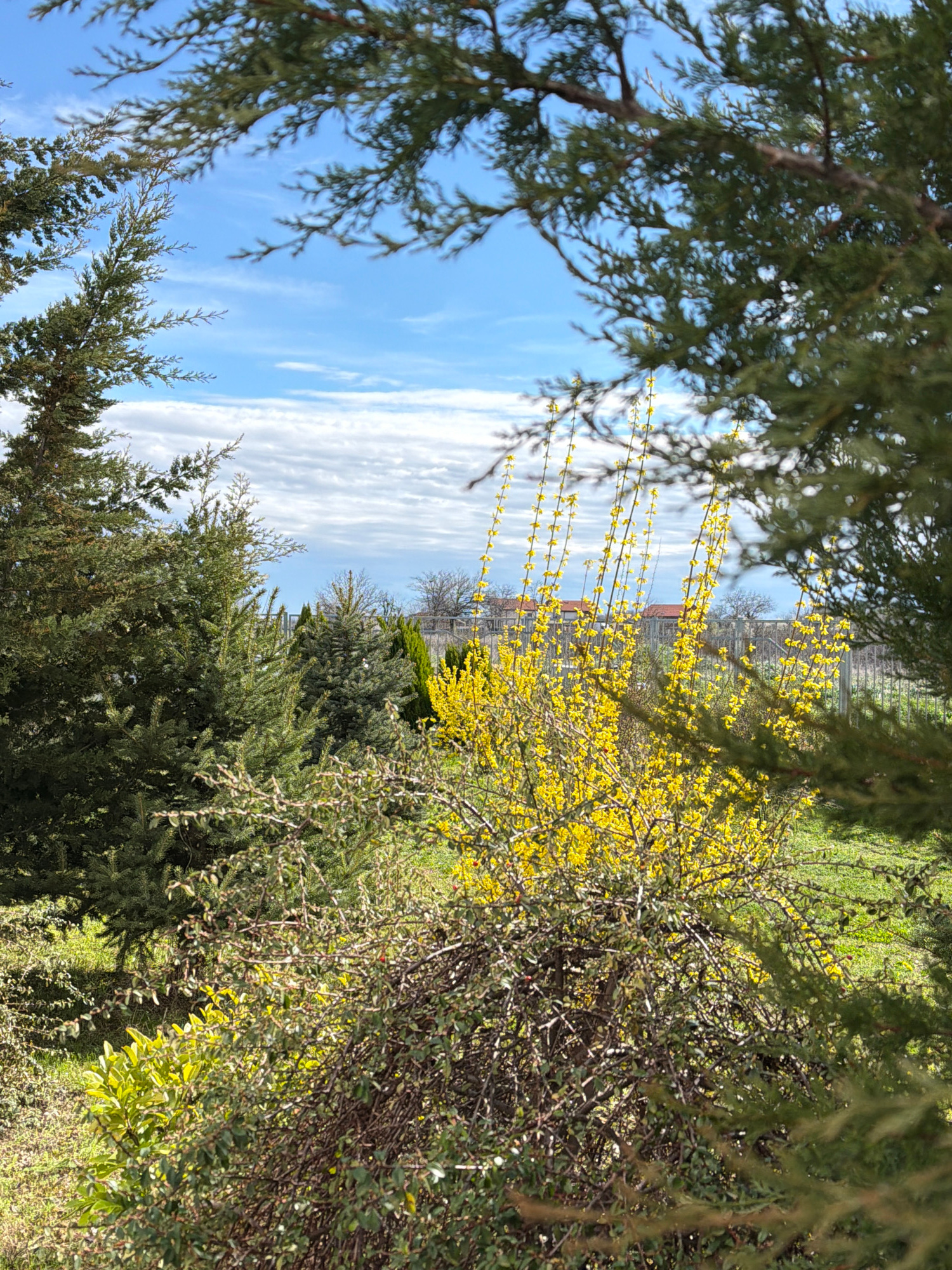 The image shows a view of the sky with wispy clouds framed by trees and bushes. The sky is blue. In the foreground, there are green pine trees and a bush with yellow flowers. In the background, a fenc…read more