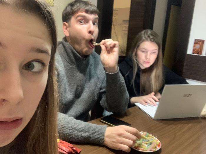 Three people are gathered at a table, engaged in various activities. A laptop sits open near one individual, who appears to be working. Another person is in the process of eating something. A plate of…read more