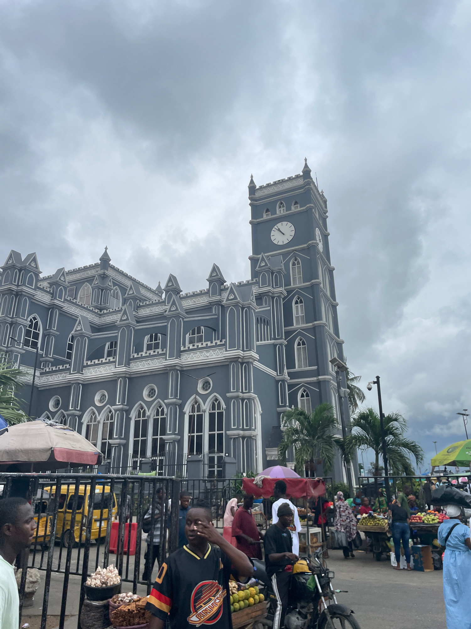 The image shows the Cathedral Church of Christ in Lagos, Nigeria, under a cloudy sky. The gray and white gothic-style architecture of the cathedral is prominent. In the foreground, a black metal fence…read more