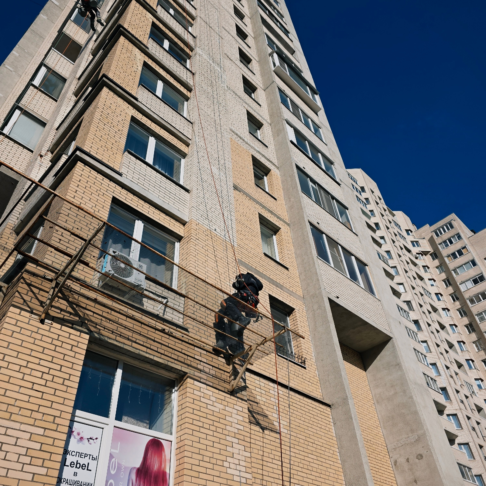 The image depicts an urban scene in Saint Petersburg, Russia, focused on a multi-story residential building under facade maintenance. The building features a mixed construction of light beige brickwork and grey concrete structural elements, with numerous windows. On the ground floor, a white-framed window displays a sign for "ЭКСПЕРТЫ LebeL в ОКРАШИВАНИИ" (LebeL Experts in Dyeing), indicating a hair salon, with graphics including cherry blossoms and a woman with red hair. Two individuals identified as industrial climbers are visible on the building's facade. In the foreground, one climber, dressed in dark workwear with orange highlights on the knees/shins and wearing a harness, is suspended by red ropes. This climber is positioned approximately on the third floor, standing on or leaning against a rusty metal grid structure that protrudes from the building, potentially supplemented by a wooden platform. The climber appears to be actively working on the facade. Below a window at this level, a white exterior air conditioning unit is mounted. Higher up and to the left, a second climber, also in dark clothing and attached to ropes, is partially visible, indicating ongoing work on a higher section of the facade. The building extends upwards, revealing many floors with various windows and small balconies or decorative protrusions. Another, more distant multi-story building with similar architecture is visible in the background to the right. The sky is clear and deep blue, suggesting a sunny day, with pronounced shadows cast on the building's facade. | Open Wire