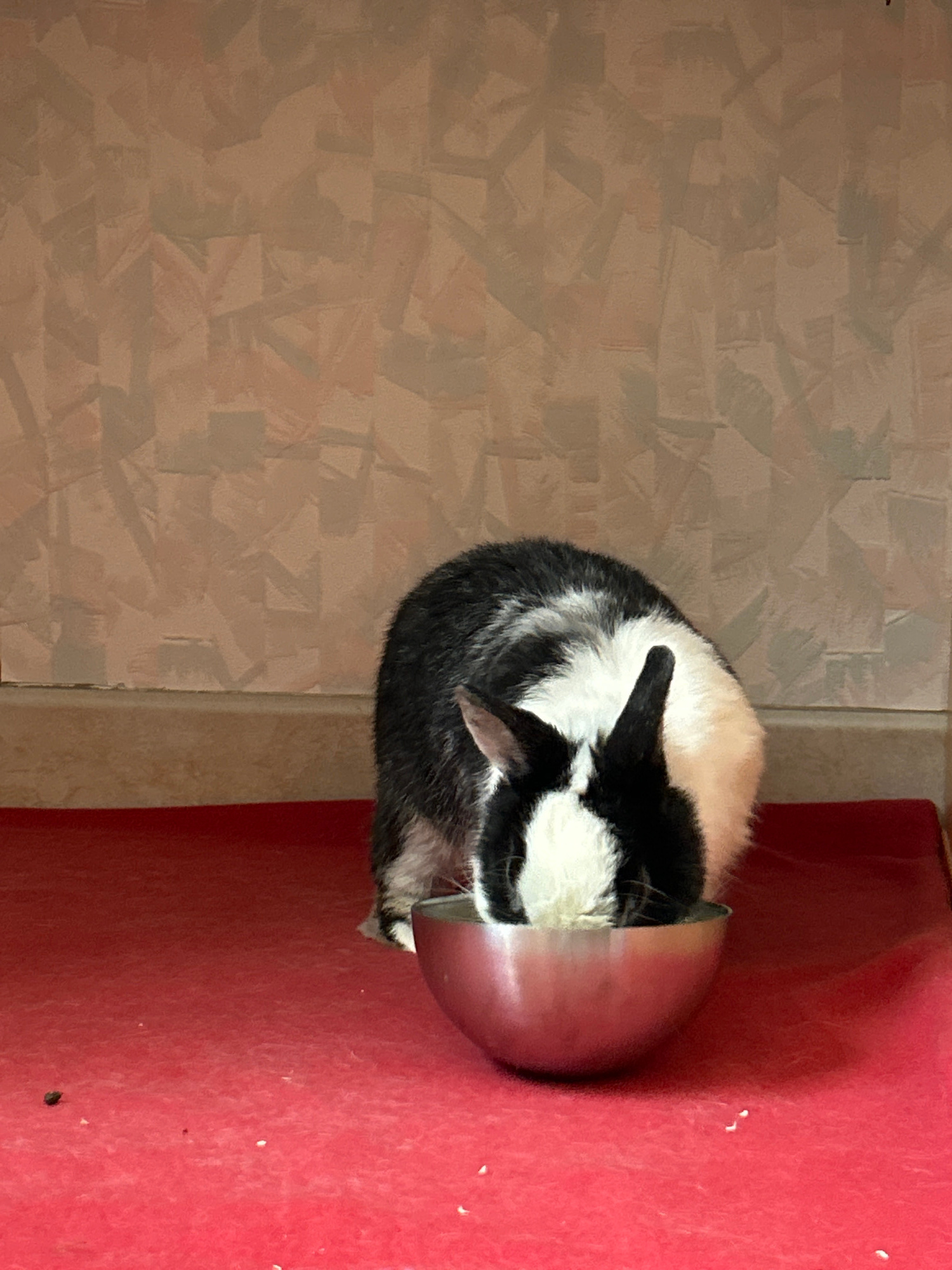 The image, rotated 90 degrees clockwise, features a black and white cat curled up tightly inside a metallic bowl. The cat's fur is primarily black with white patches on its chest, face, and legs, and…read more