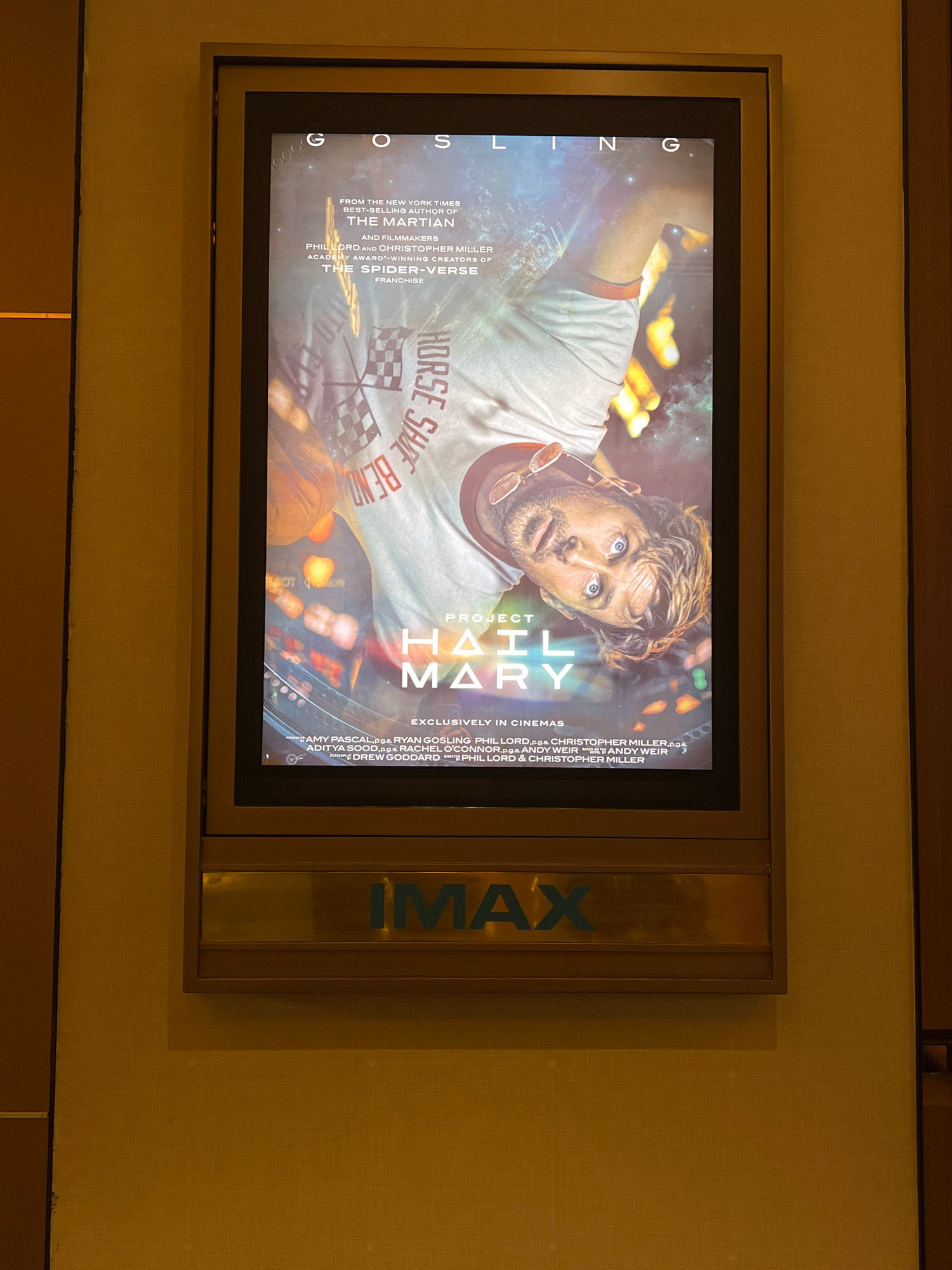 The image shows a promotional poster for the movie "Project Hail Mary," starring Ryan Gosling. The poster is displayed in a backlit frame with an "IMAX" logo on the right side. The poster promotes Rya…read more