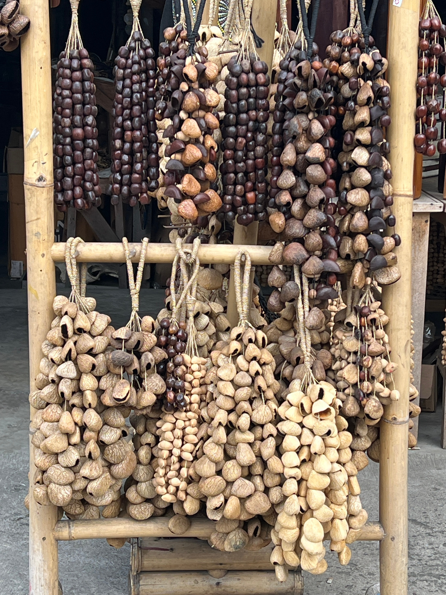 The image shows several rows of handmade percussion instruments displayed on a bamboo frame, probably for sale. These instruments appear to be made from seeds or nuts strung together to create a rattl…read more