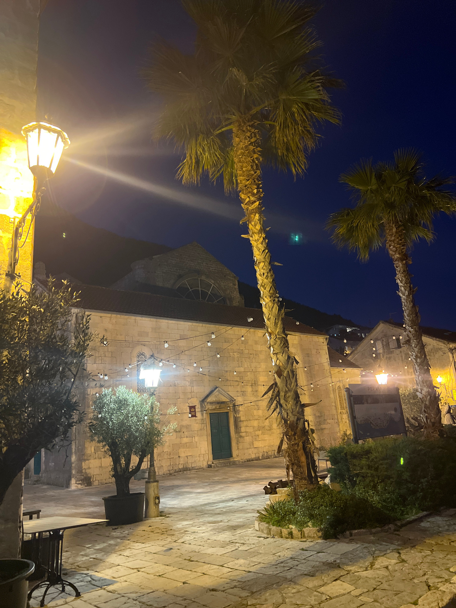 The image is an eye-level, low-angle, nighttime view of a street in Perast, Montenegro. A narrow cobblestone-paved street is flanked by a stone building, likely a church, with a rounded window above aβ¦read more