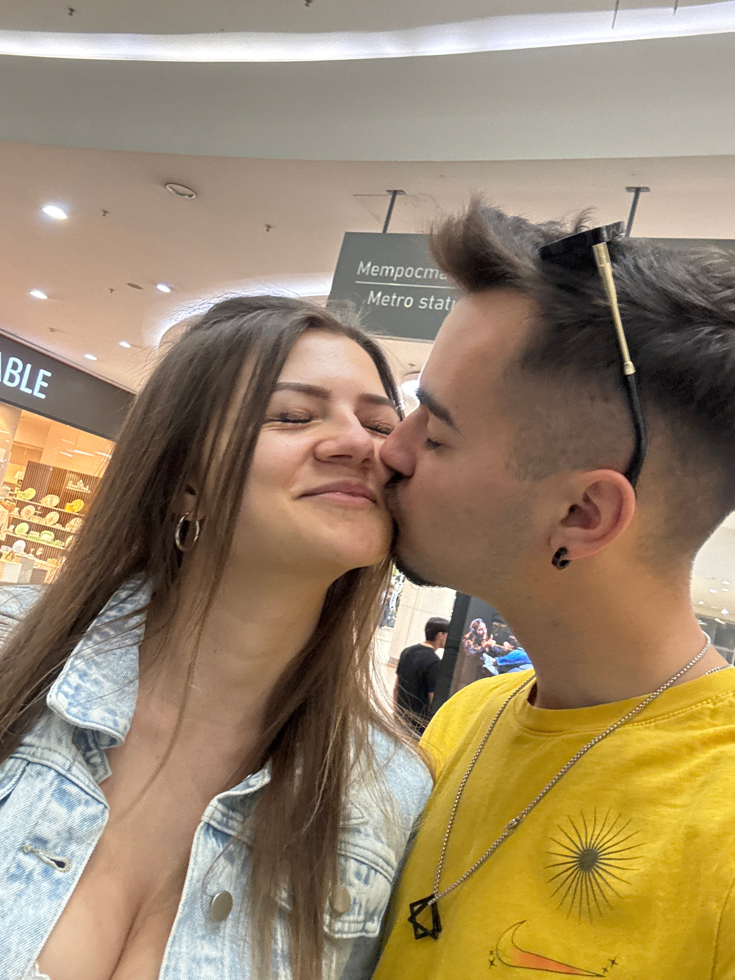 A couple poses for a photo indoors. The man is kissing the woman's nose. He wears a yellow shirt with a sunburst design, a silver chain necklace with a Star of David pendant, and sunglasses perched at…read more