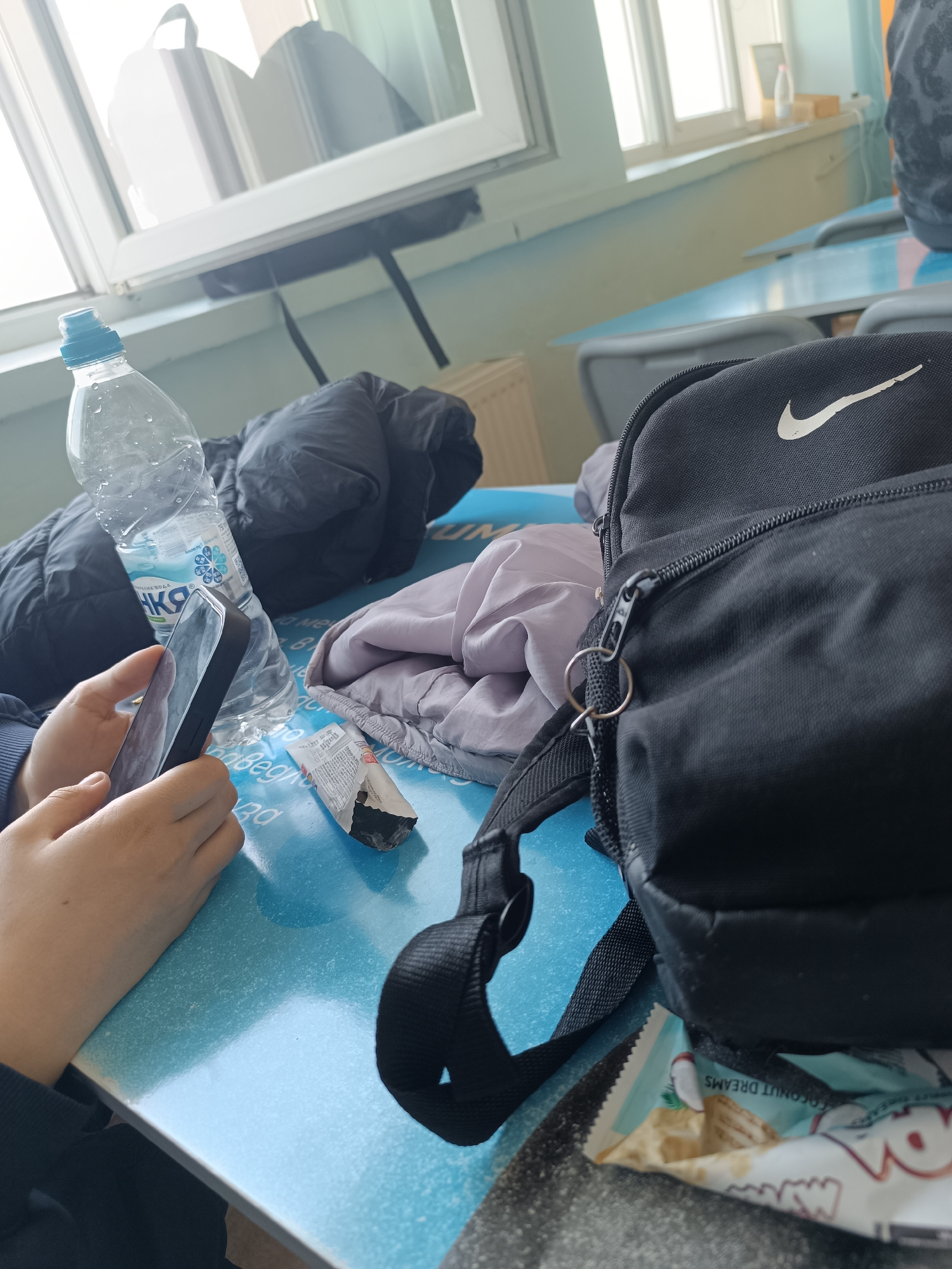 The image shows a person sitting at a desk in a room with a window. The person is holding a smartphone in their hands. On the desk, there is a water bottle, a jacket, a piece of clothing, a snack, and…read more