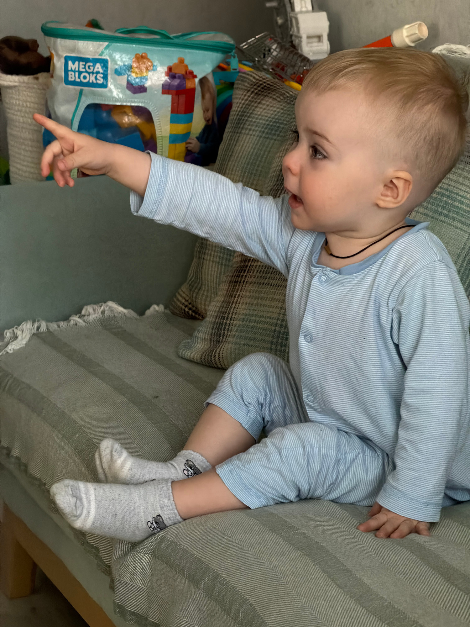 A young child, likely a toddler, lies on a striped, green and beige sofa. The child wears a light blue, striped one-piece garment and grey socks with a small cartoon car on each. The child is fair-ski…read more