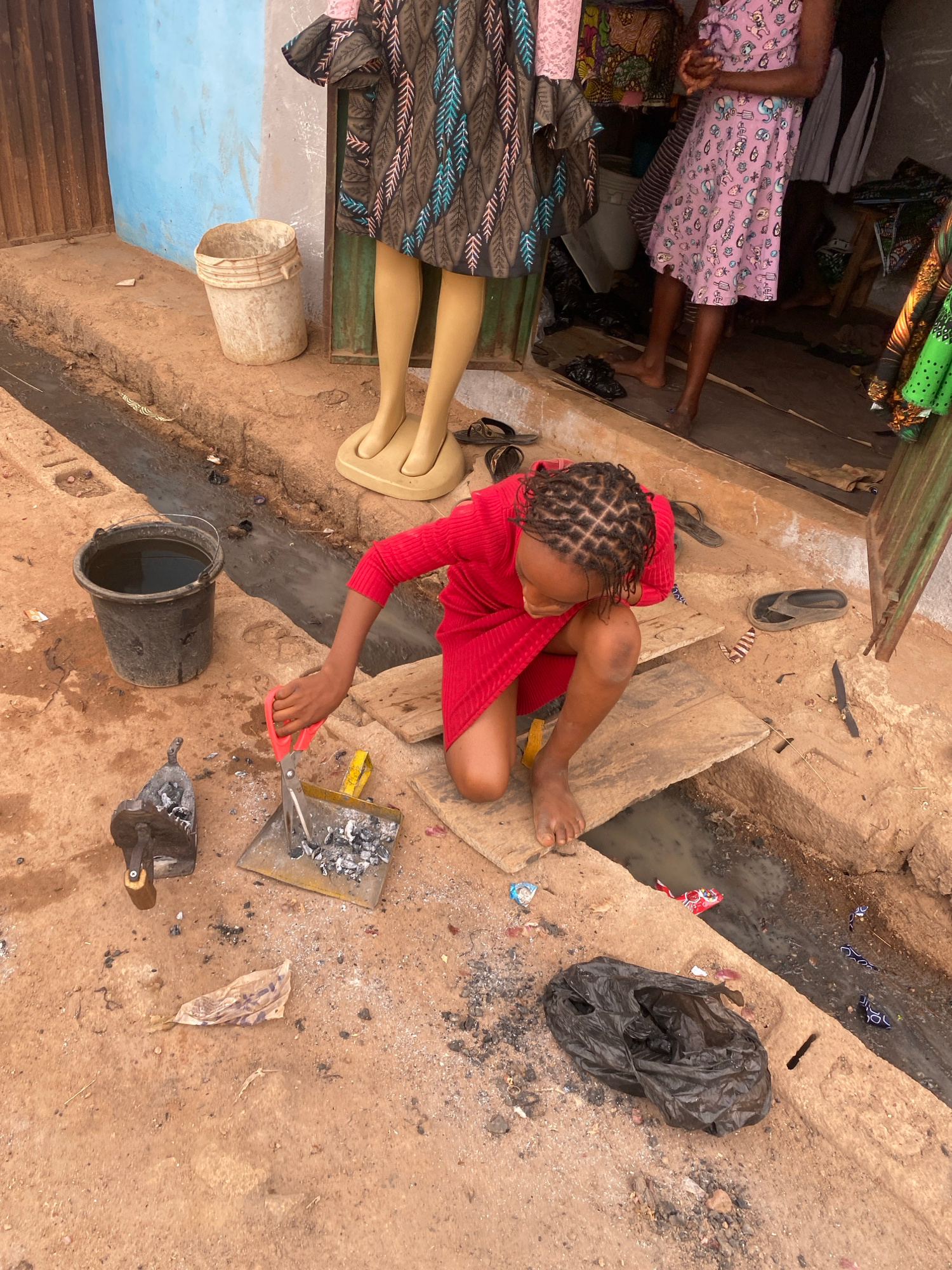 A high-angle outdoor shot shows a woman in Rido, Nigeria sitting barefoot on a concrete ledge, using red-handled scissors to manipulate charred materials on a metal dustpan. The woman, wearing a red d…read more