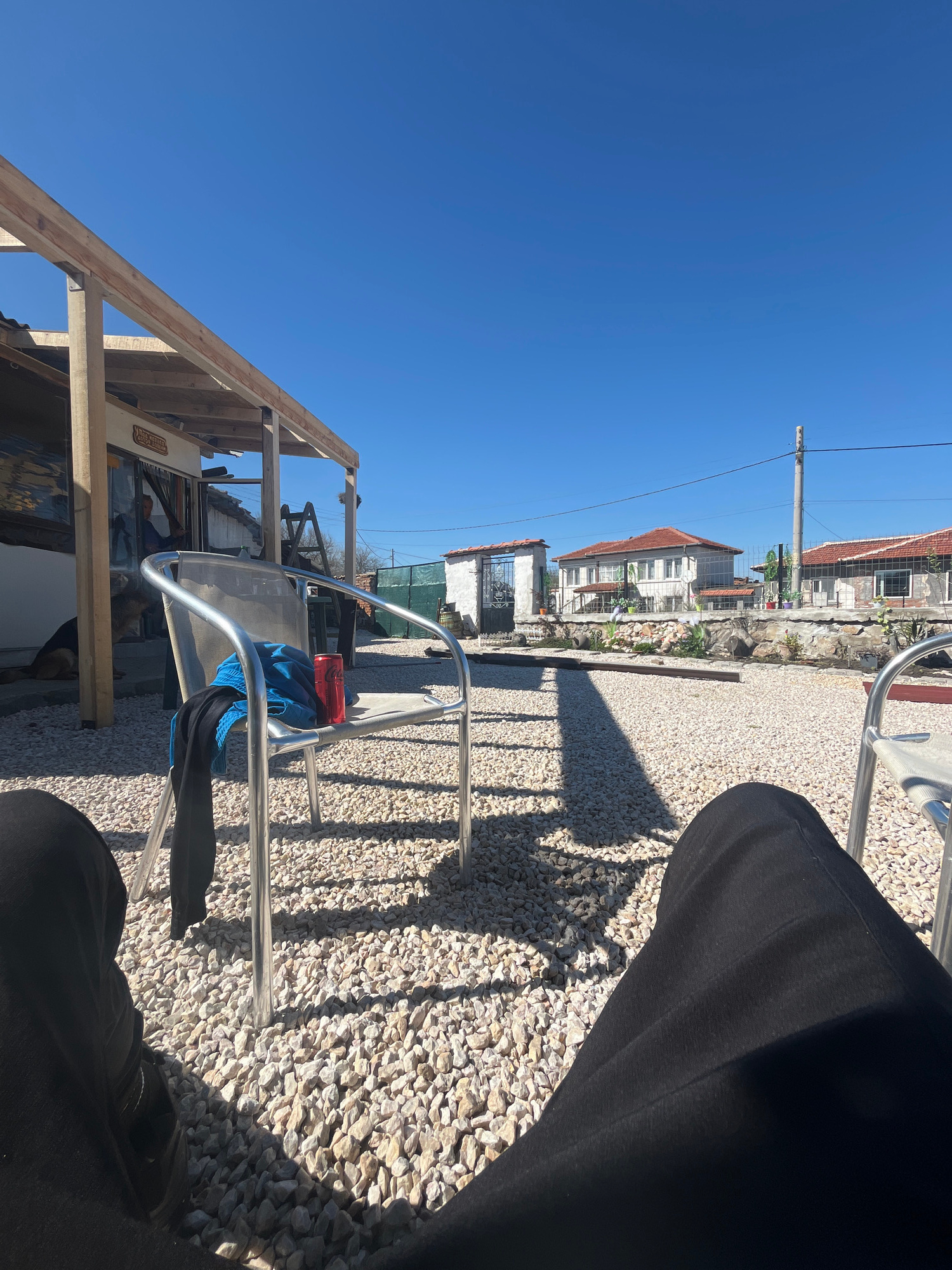 A person sits in a metal chair on a gravel surface in Goliamo Asenovo, Bulgaria. A blue cloth and a red container sit on the chair. Construction materials are visible to the left. Residential building…read more