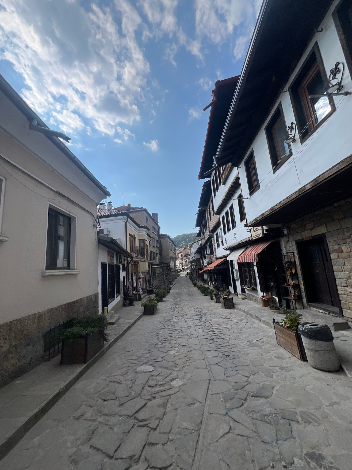 The image captures a sunny, daytime view down a narrow, historic street or alley, characteristic of Veliko Tarnovo, Bulgaria. The stone-paved street, composed of irregular, light-colored slabs, recede…read more