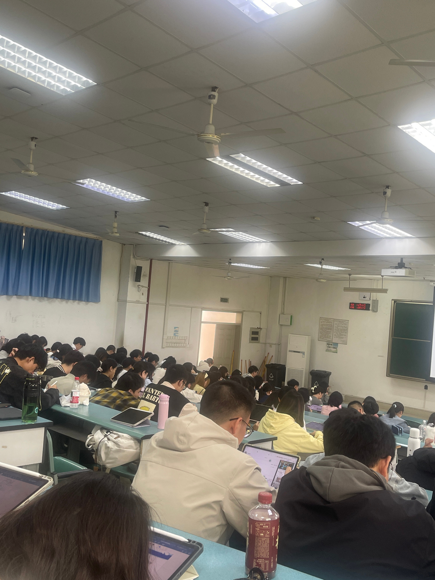 The image shows a crowded classroom in Chongqing High-tech Zone, China. Students are seated at desks, most using laptops or tablets. Some are wearing jackets and backpacks. A blackboard is visible at…read more