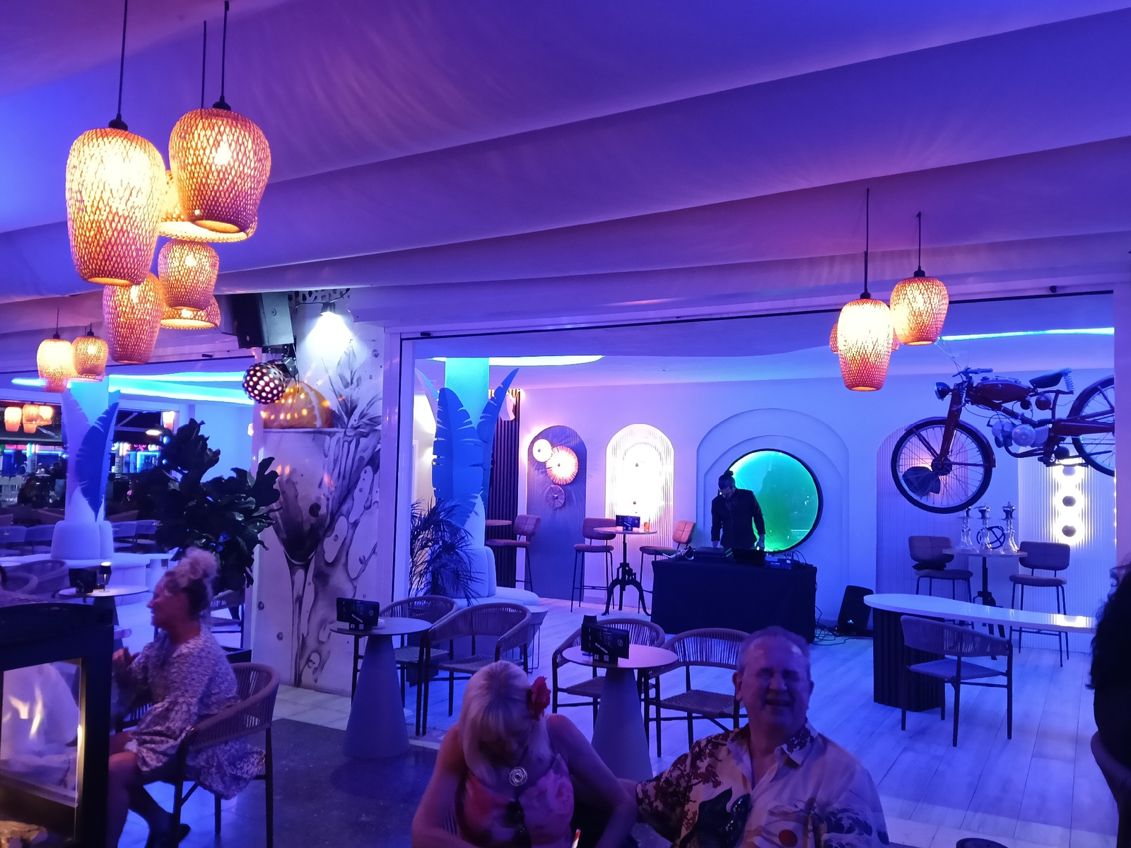 A nighttime scene in a bar setting in Playa Del Inglés, Spain. There are five patrons and one DJ. The DJ stands behind his equipment in the center of the image. The interior of the bar features severa…read more