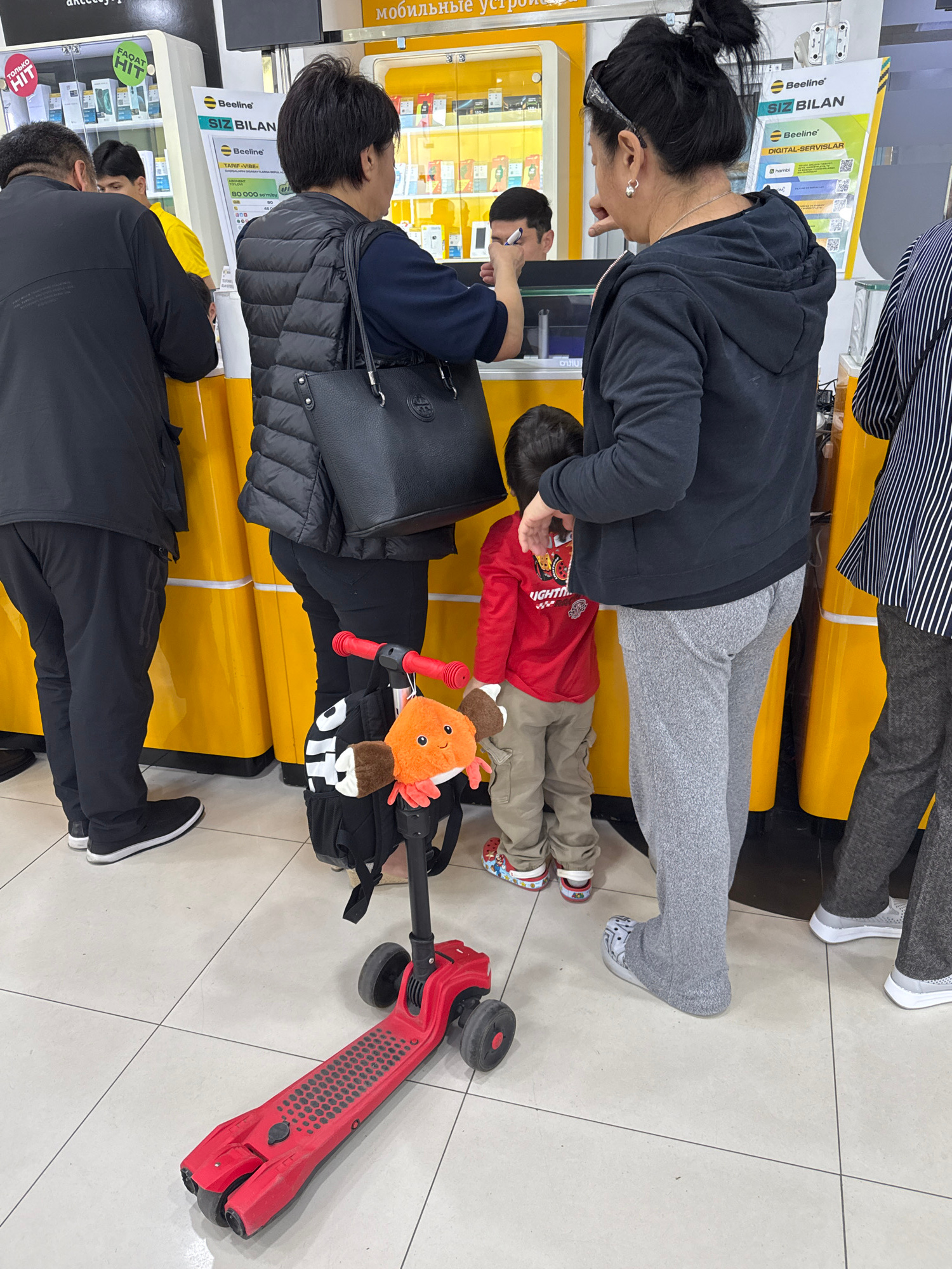 The image shows a scene inside a mobile phone store in Tashkent, Uzbekistan. People are gathered near yellow counters displaying phone service provider Beeline's promotional materials written in Uzbek…read more