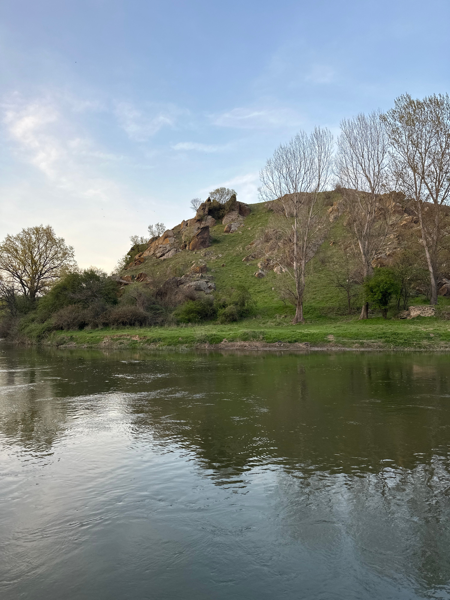 The image depicts a river scene in Krumovo, Bulgaria. The river is wide and reflects the sky and the opposite bank. The bank is characterized by a steep, grassy hill with rocky outcrops and scattered…read more