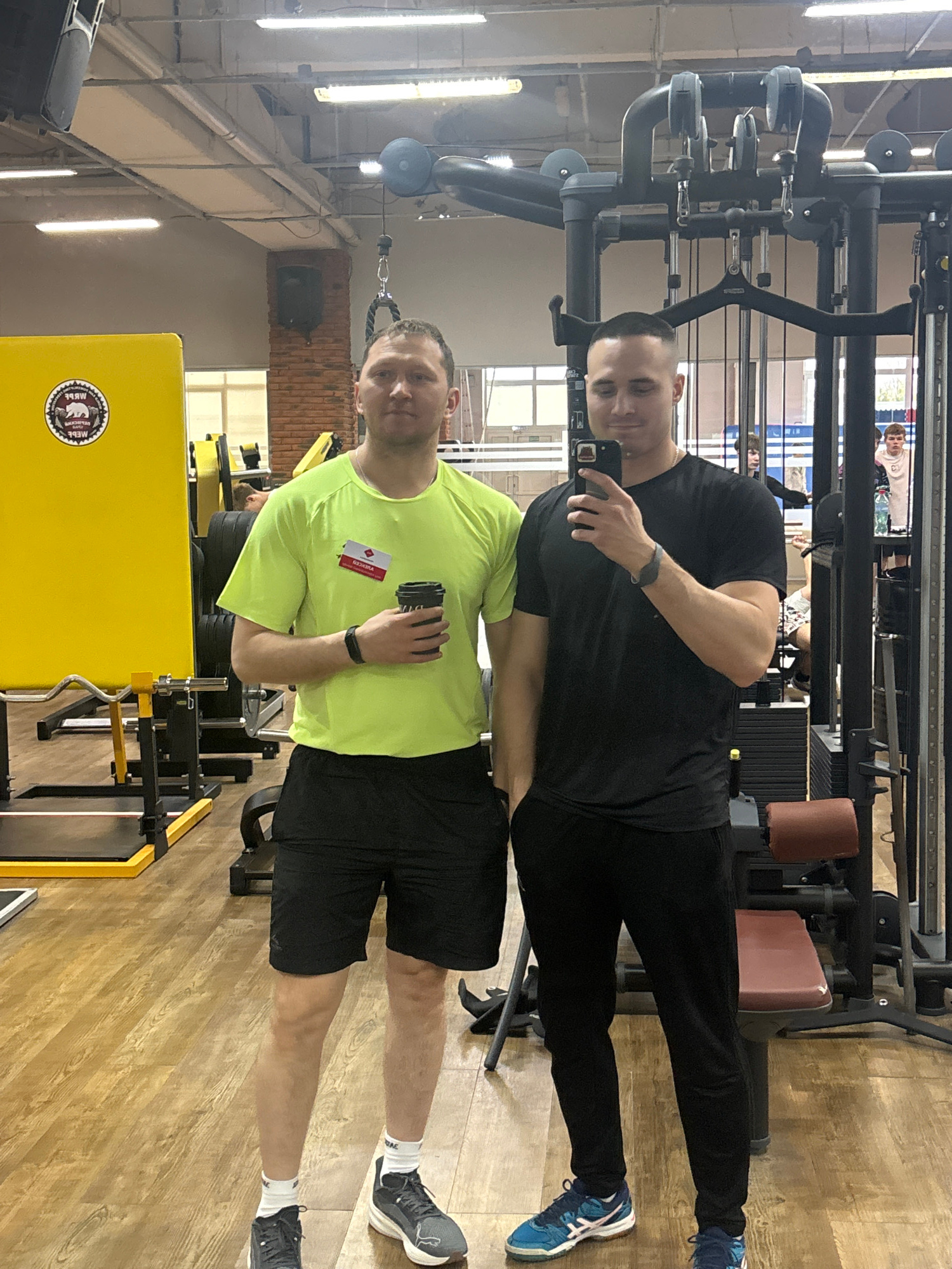 The image shows two men posing for a selfie in what appears to be a gym. One man, wearing a black t-shirt and black pants, is holding a phone and taking the picture. The other man, wearing a lime gree…read more