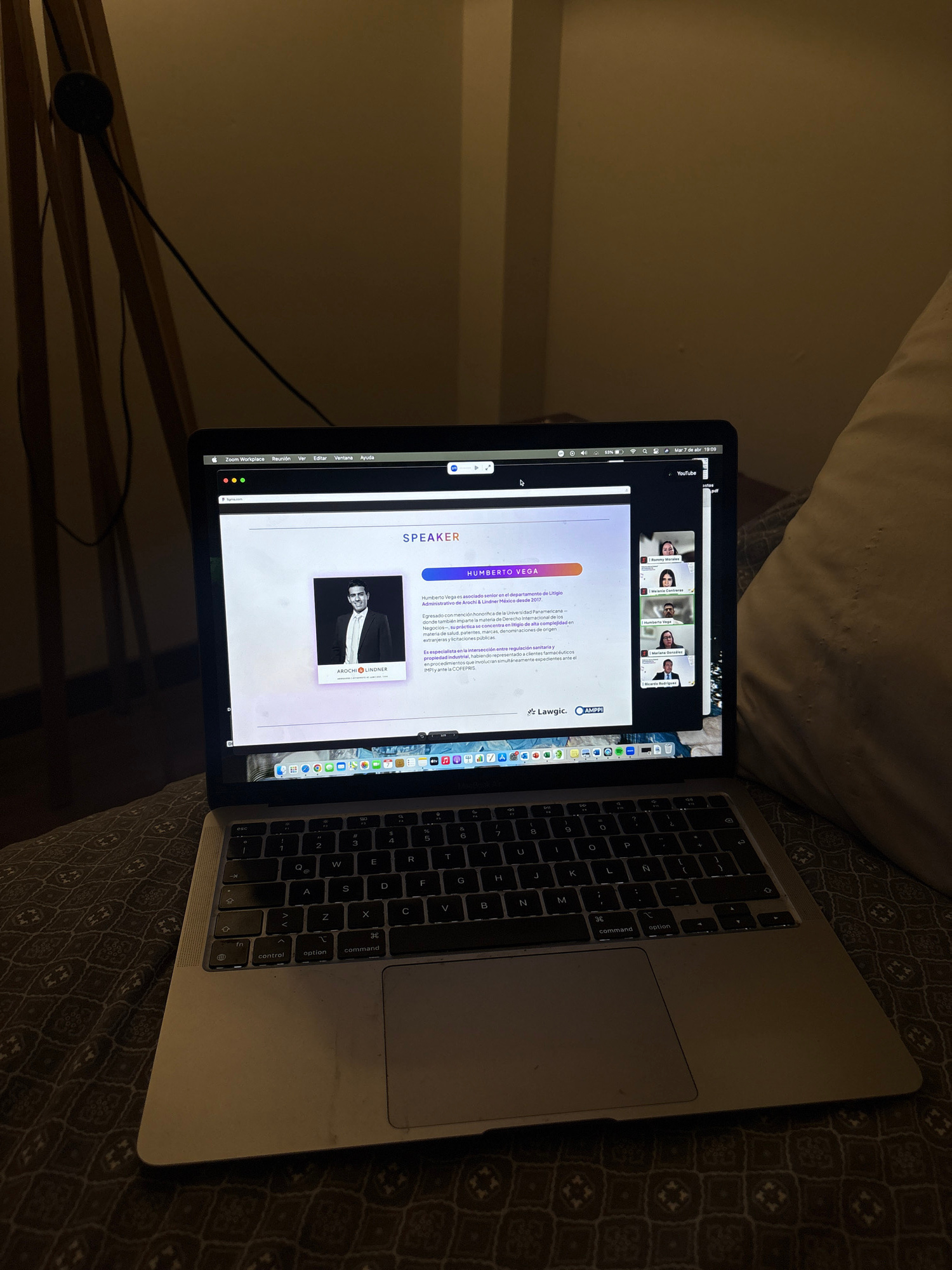 Here's a forensic description of the image: **Scene:** The image depicts a laptop computer resting on what appears to be a bed or couch with patterned upholstery. A pillow is visible in the backgroun…read more