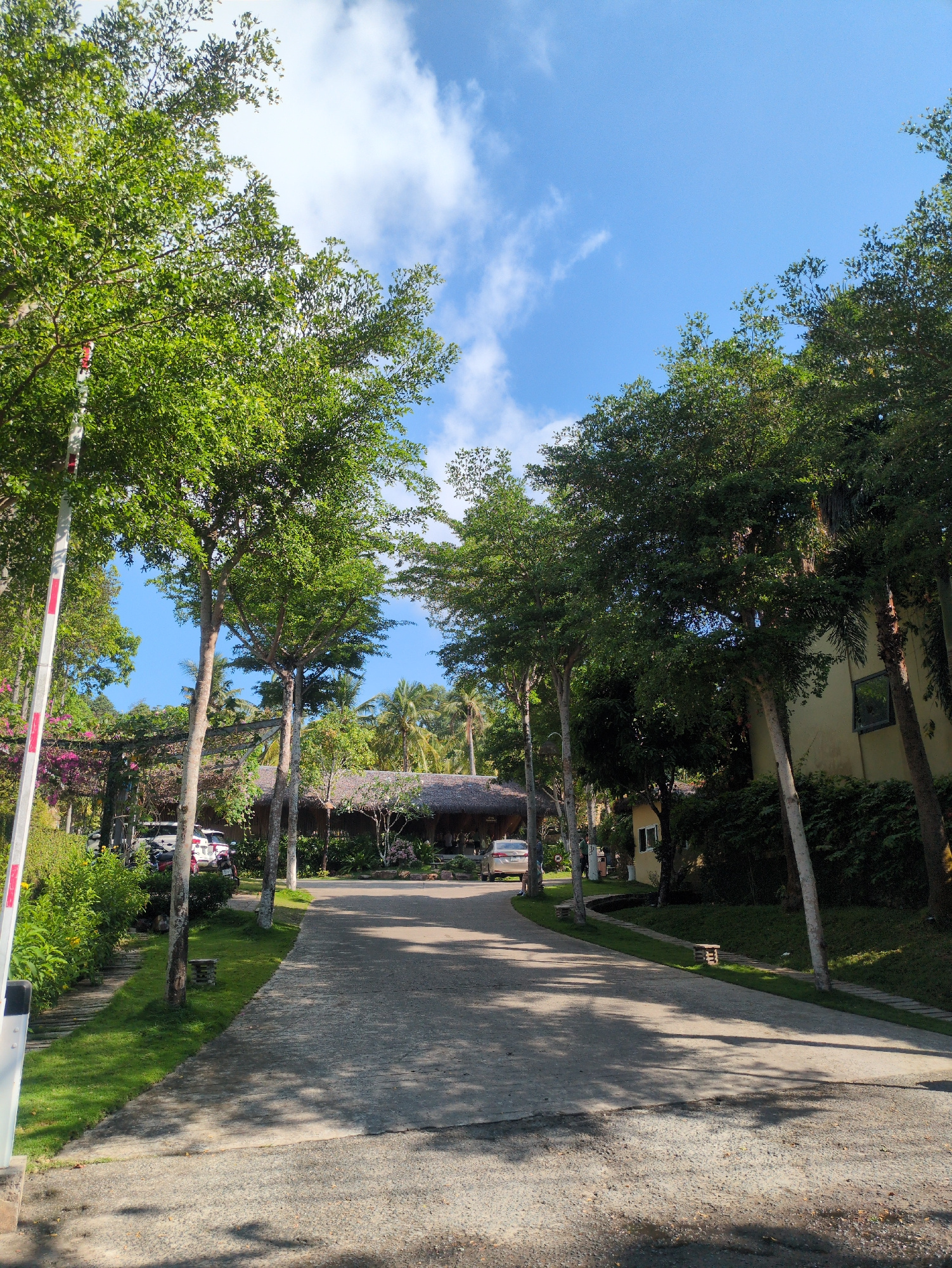 The image depicts a tree-lined driveway or road in Phú Quốc, Vietnam. The road surface is gray and appears to be paved with either asphalt or concrete. Tall, slender trees line both sides of the road,…read more