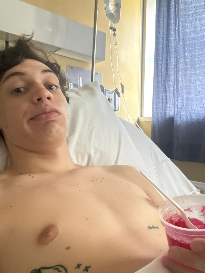 In a horizontal indoor shot, a person lies in a hospital bed with an IV drip visible. The person is fair-skinned and has tattoos on their chest. Someone holds a clear container with a red, possibly ic…read more