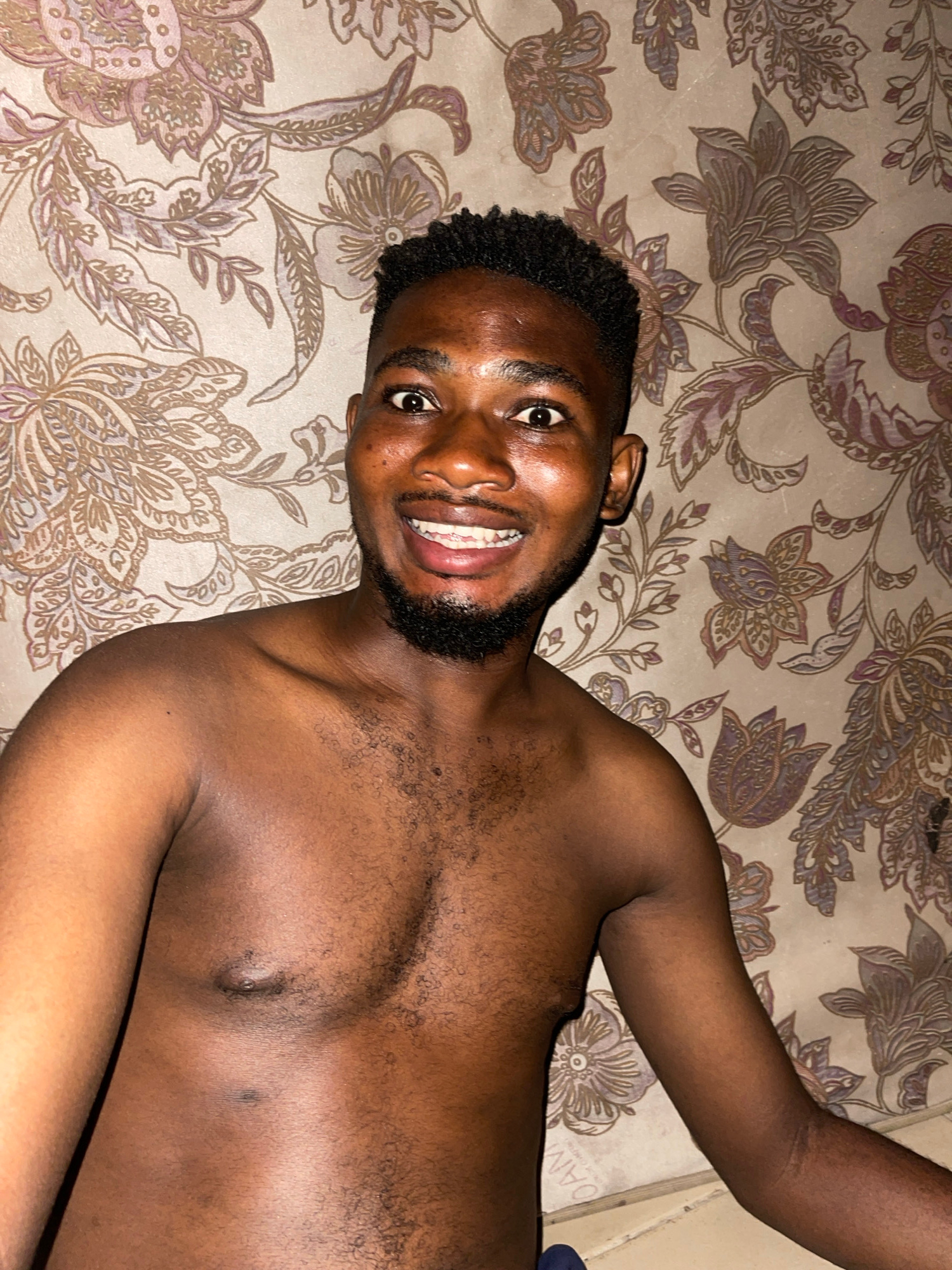 A shirtless man is lying on a patterned surface, possibly a bed or couch, indoors. He is dark-skinned with short, dark hair and a beard, and he is smiling. The background is a floral pattern in shades…read more