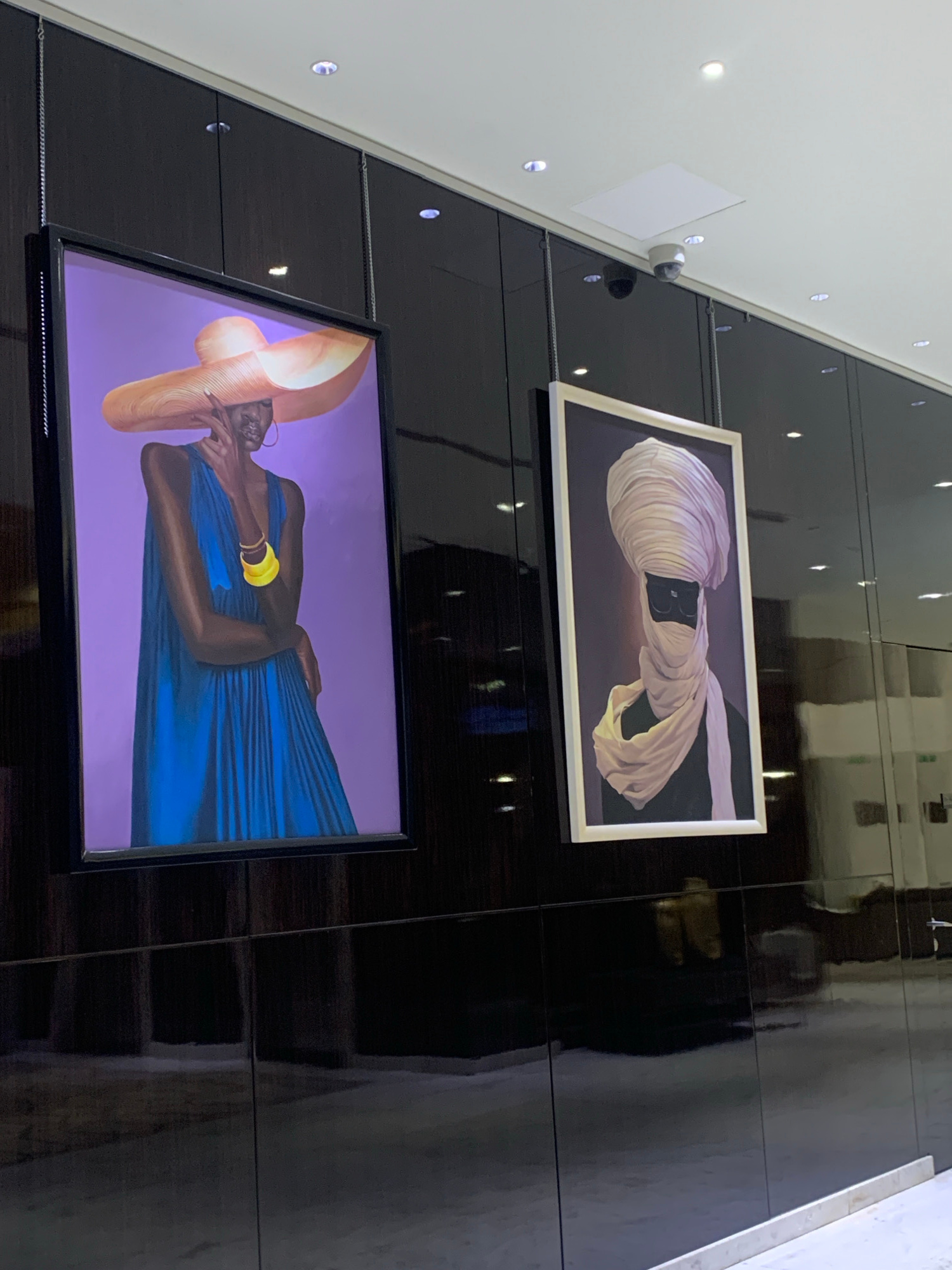 The image shows two framed artworks hanging on a glossy, dark-colored wall in what appears to be an interior space in Dar es-Salaam, Tanzania. The lower artwork depicts a woman wearing a large hat and…read more