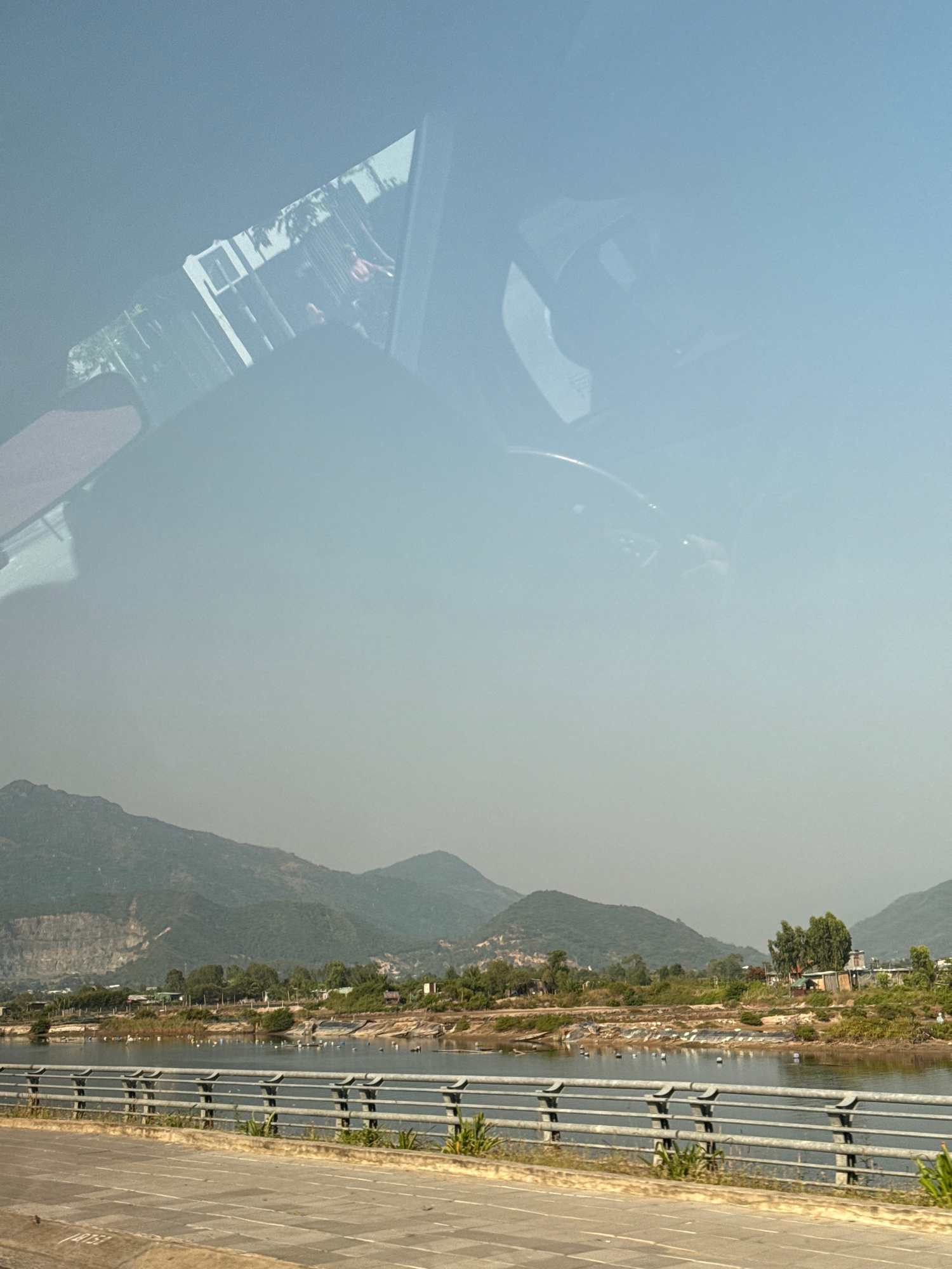 The photograph, taken from the inside of a car, presents a view of a waterway in Unknown, Unknown, bordered by a mountain range. The reflections in the car window obscure the left side of the image. T…read more
