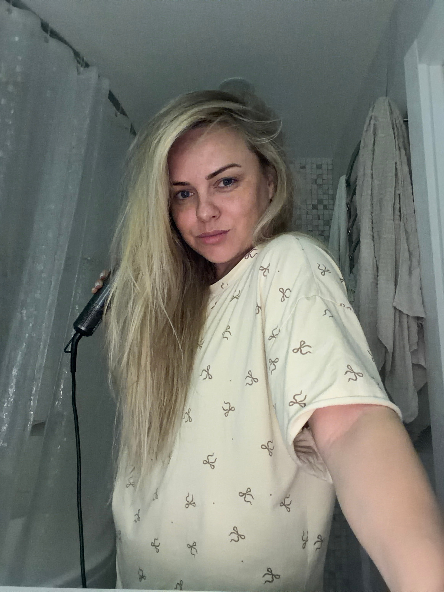 The image, oriented vertically on its side, shows a woman's upper body and face in what appears to be a bathroom. The woman has long, straight blonde hair that covers part of her chest and extends towβ¦read more