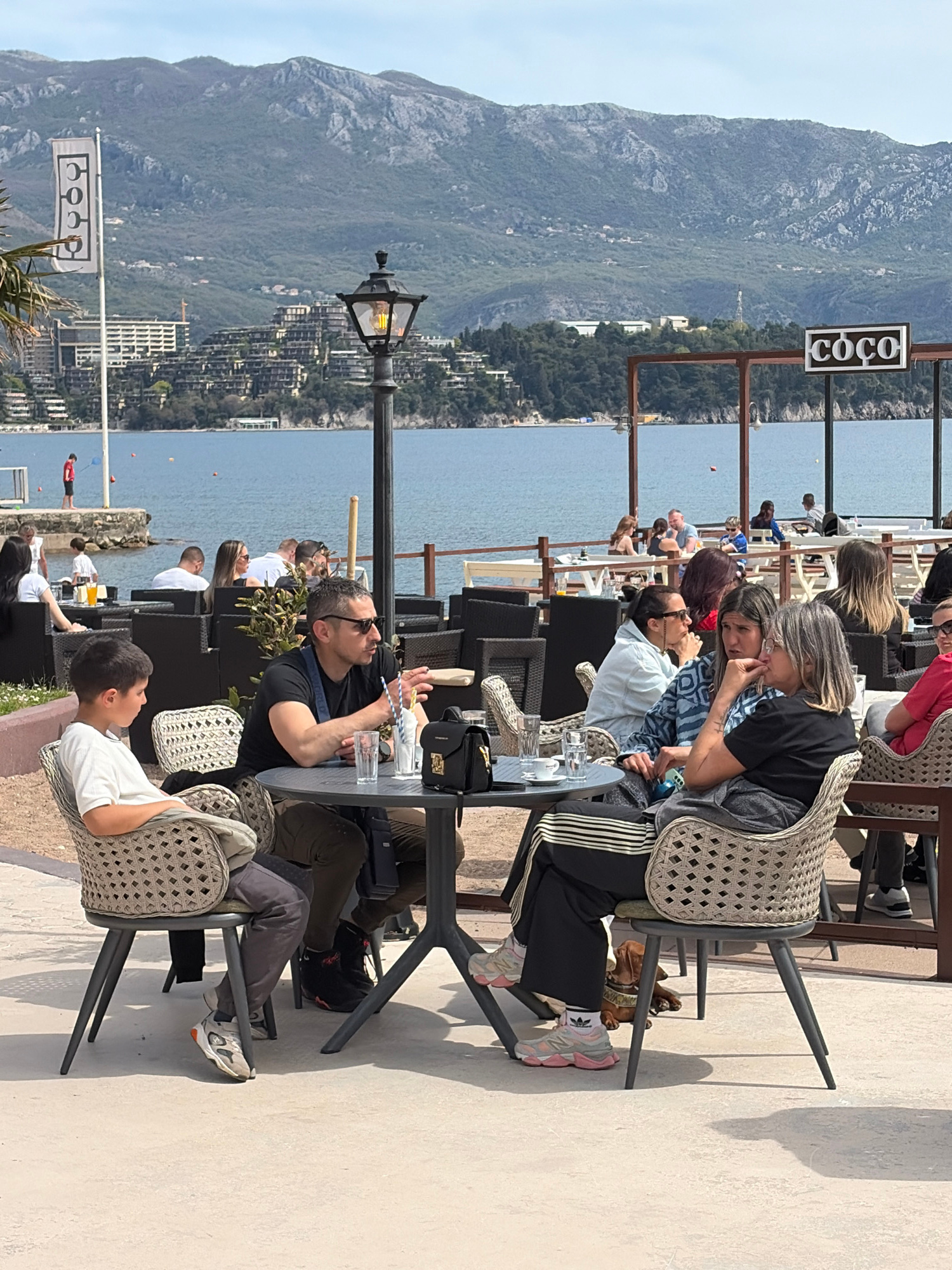 The image shows a scene at an outdoor restaurant or cafe in Budva, Montenegro, with a view of the sea and mountains in the background. Several people are seated at tables, engaging in conversation and…read more