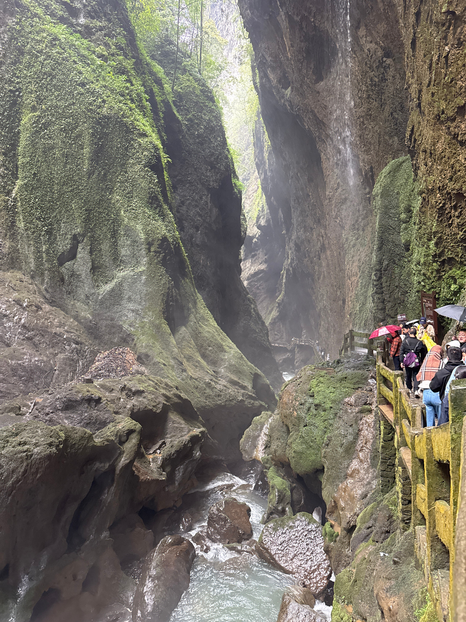 The image depicts a deep, moss-covered gorge in Wulong District, China. A group of people is standing on a walkway at the top of the gorge, some holding umbrellas. A waterfall flows down the side of t…read more