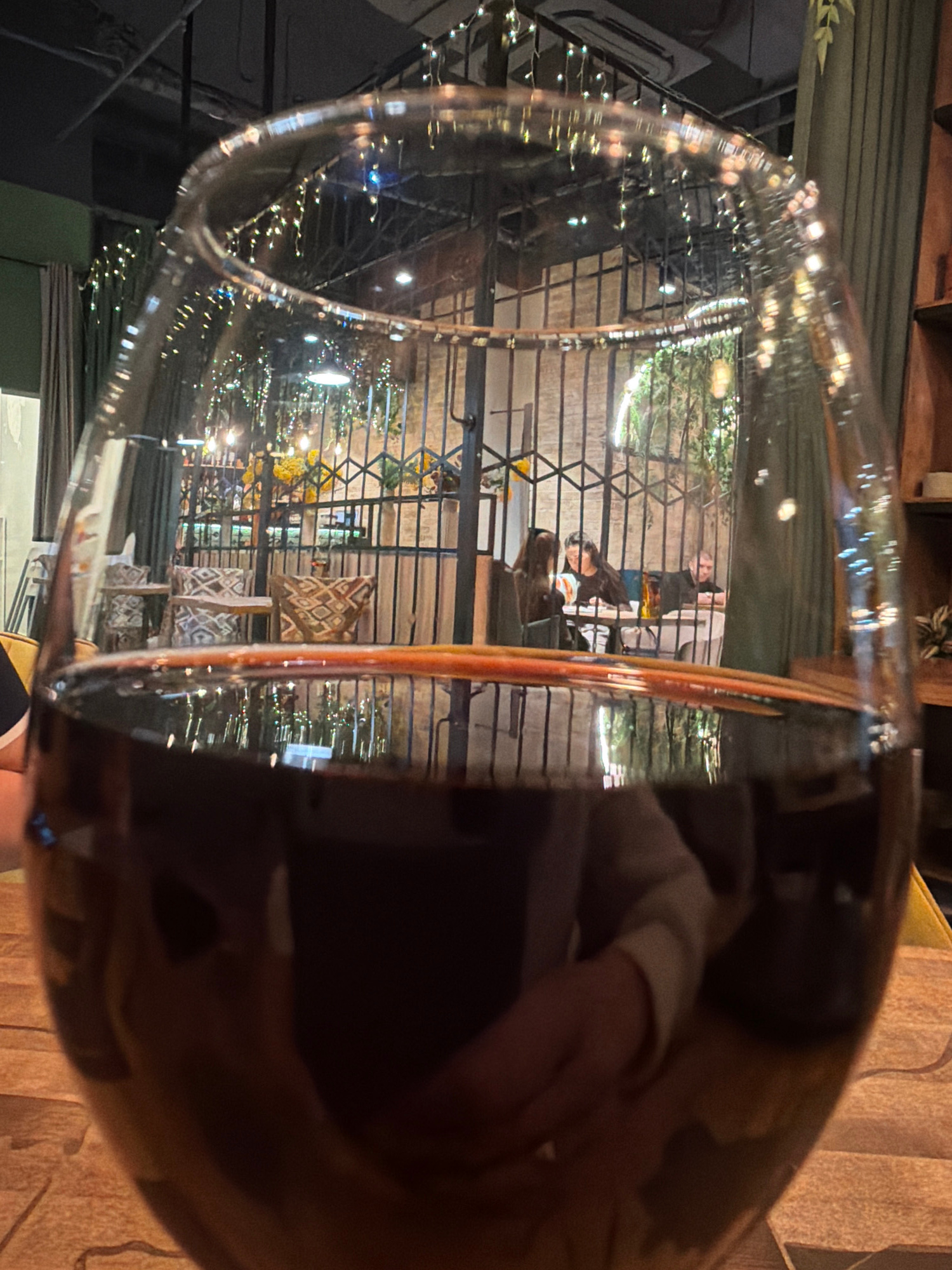 The image depicts a close-up of a wine glass filled with a dark liquid, likely red wine, with a distorted view of the surroundings visible through the glass. The backdrop appears to be a restaurant or…read more