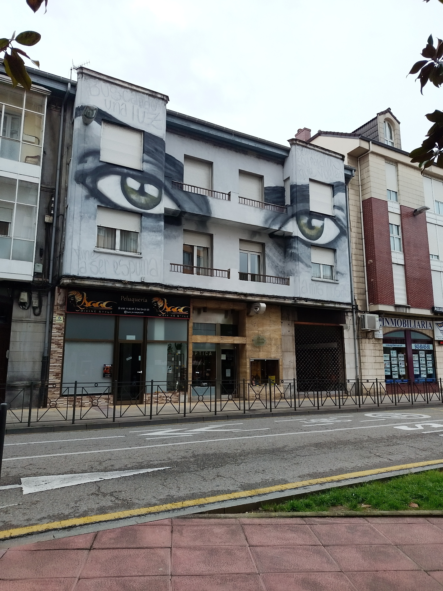 The image depicts a three-story building in the city of Torrelavega, Spain, distinguished by a large mural of two eyes painted on its facade. The building houses several businesses at street level, in…read more
