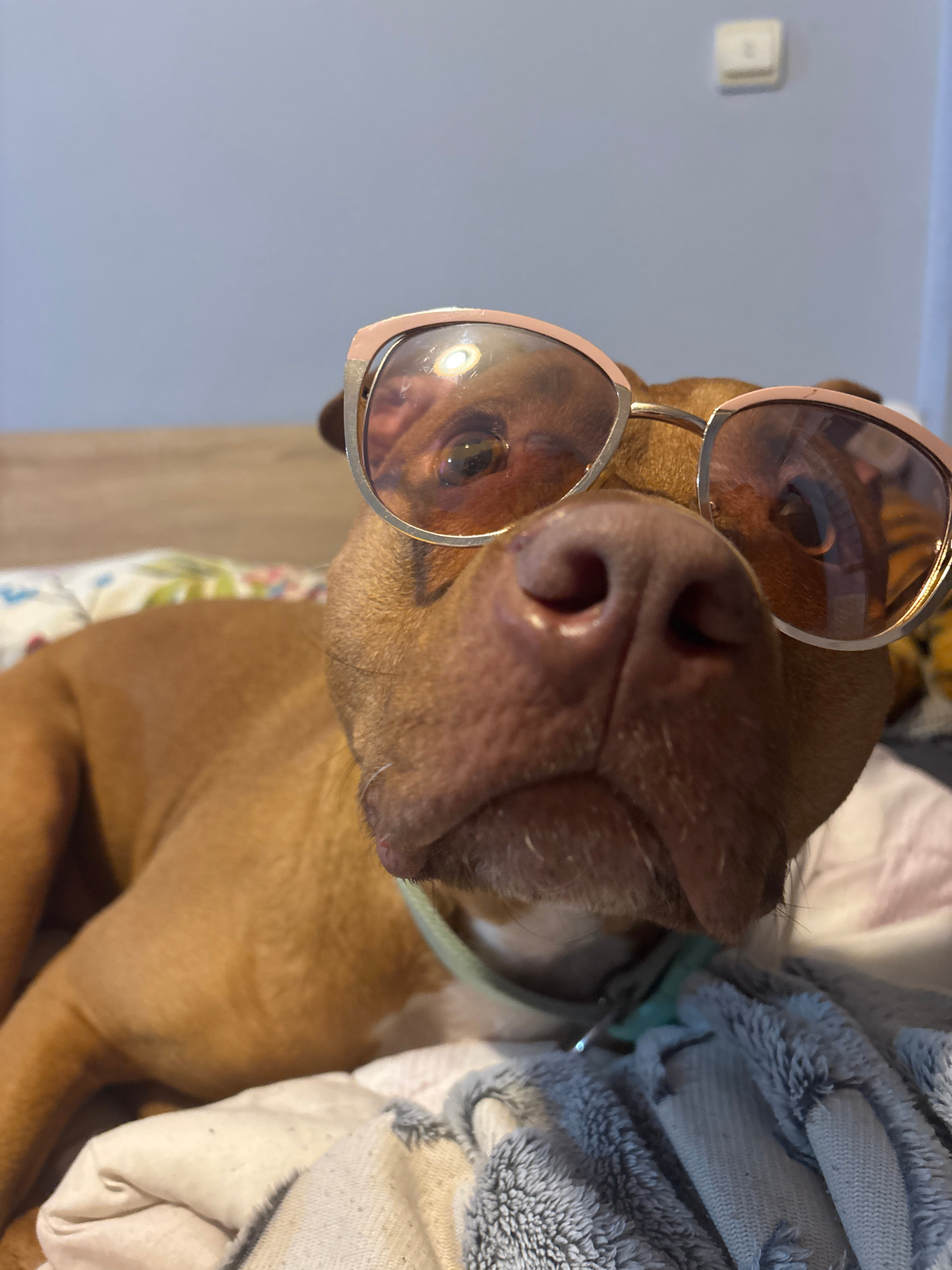A brown dog with a large, wet nose is wearing rose-gold sunglasses, lying down. The dog is on a bed with a patterned sheet and a gray, textured blanket. The background includes a light blue wall and a…read more