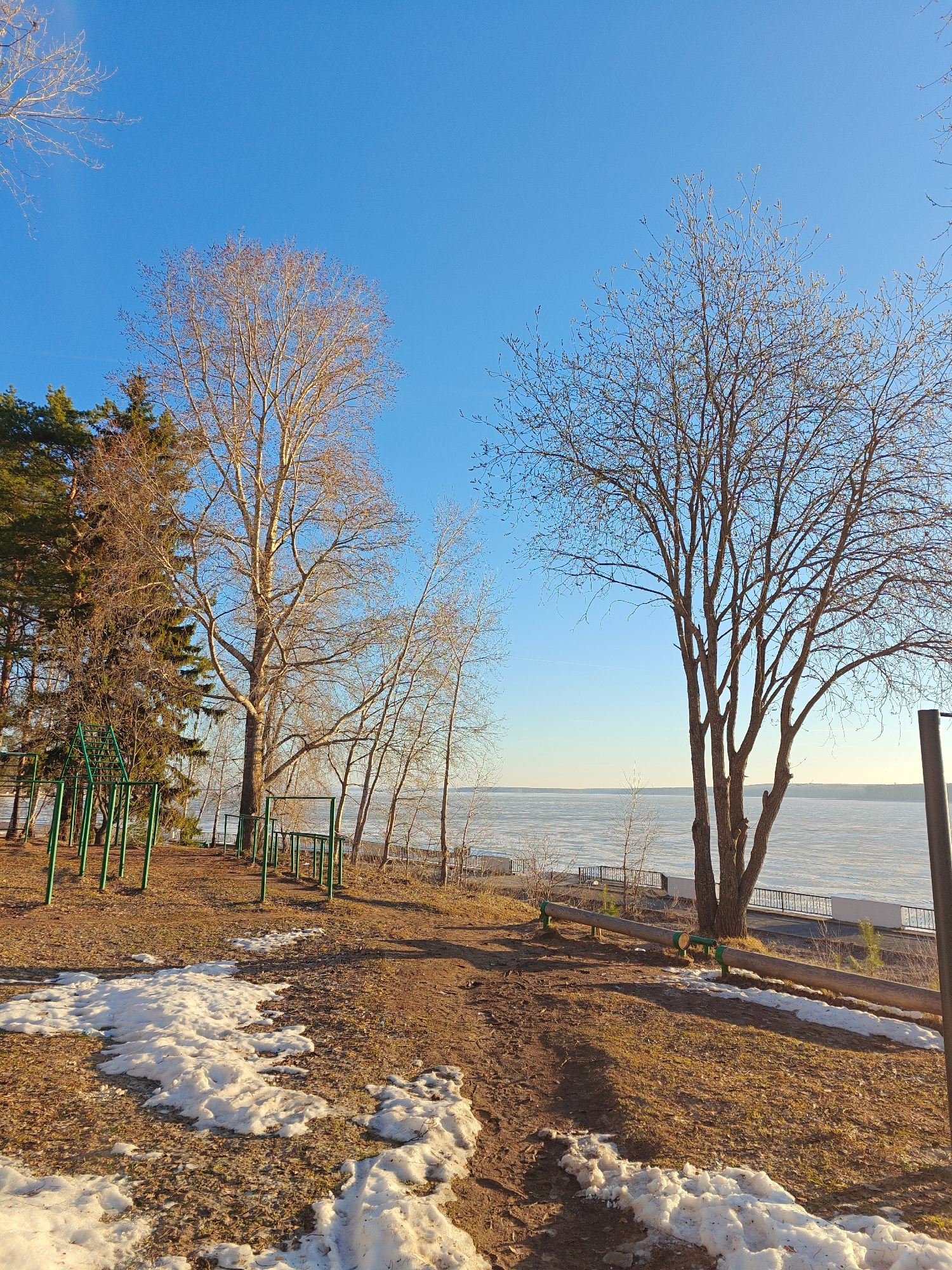 The image depicts a scene in Chaikovsky, Russia, with a clear blue sky above. The foreground features a dirt path with patches of melting snow. To the left, there is a playground area with green metalβ¦read more