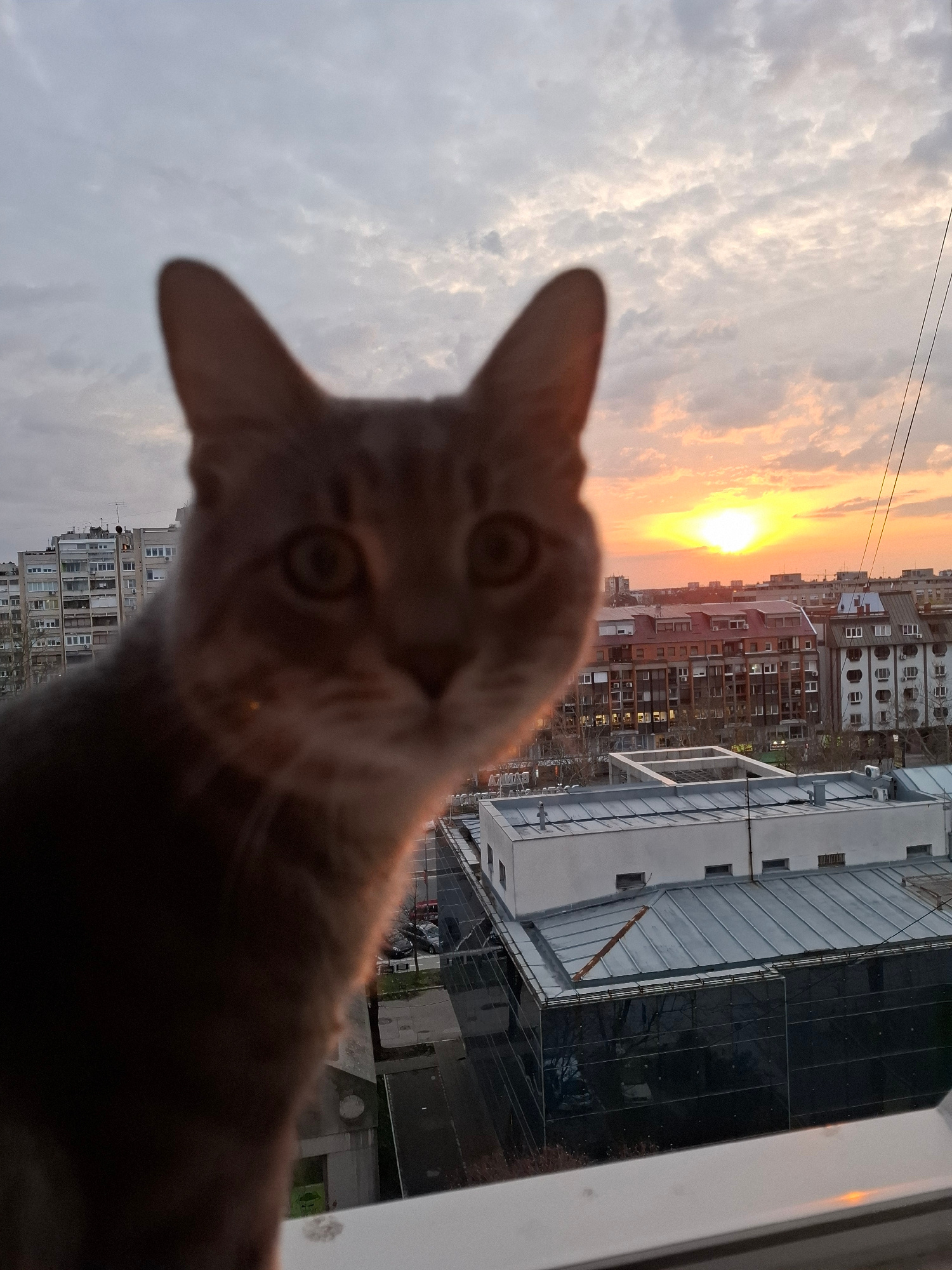 A close-up shot shows a light brown cat's head in the foreground, positioned slightly off-center to the left. The cat appears to be looking directly at the camera. The background features a cityscape…read more