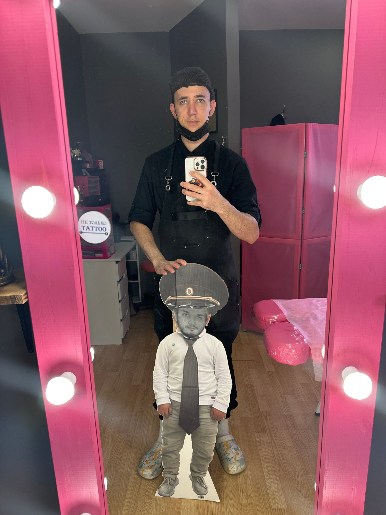 The scene is an interior view of a commercial establishment in Saratov, Russia, identified as a tattoo studio by a visible sign. A male individual is reflected in a large, vertical, bright pink vanity mirror, which is illuminated by multiple exposed bulb lights along its frame. The man wears a dark, short-sleeved top or apron with chest straps, a black face mask positioned below his chin, and a dark hairnet or cap. He holds a white smartphone, its screen facing the viewer, as if capturing his reflection. Positioned on the floor directly in front of the reflected man is a cardboard cutout of a small person. This cutout depicts a figure wearing a white long-sleeved shirt, a dark tie, light-colored pants, and a military-style peaked cap. The background, visible through the mirror's reflection, consists of dark grey walls and a light-colored wood laminate floor. To the left, a white desk with multiple drawers holds various items, including a black portable speaker. Above the desk, a round white sign with the Russian text "НЕ ТОЛЬКО TATTOO" (NOT ONLY TATTOO) is displayed. To the right, a pink folding room divider stands behind a pink upholstered examination or procedure table, which is covered with a clear protective plastic sheet. | Open Wire