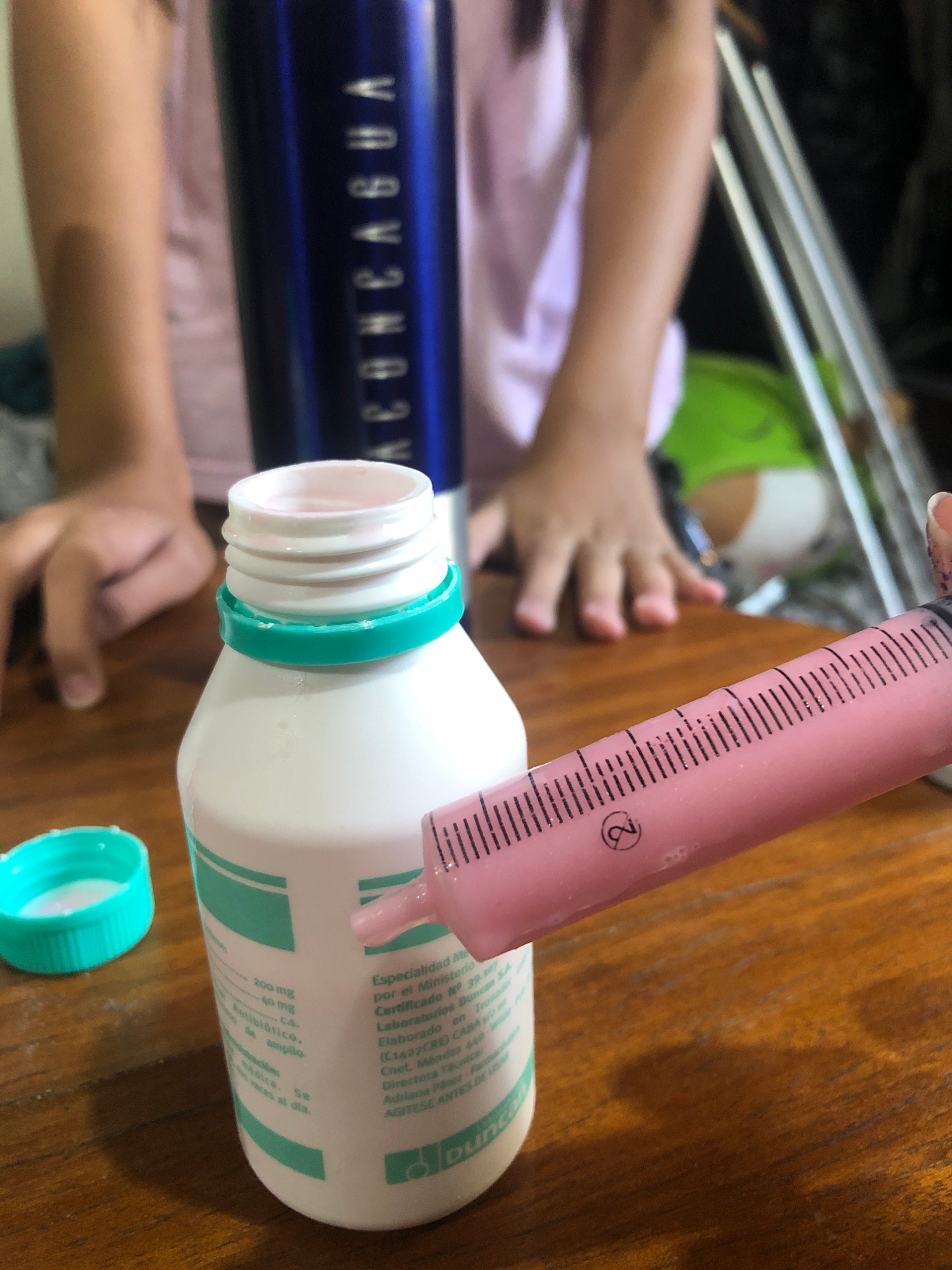 A close-up shot shows a pink liquid medication being drawn from a white bottle with a light green label and cap using a pink syringe. The bottle is partially labeled in Spanish and identifies the medi…read more