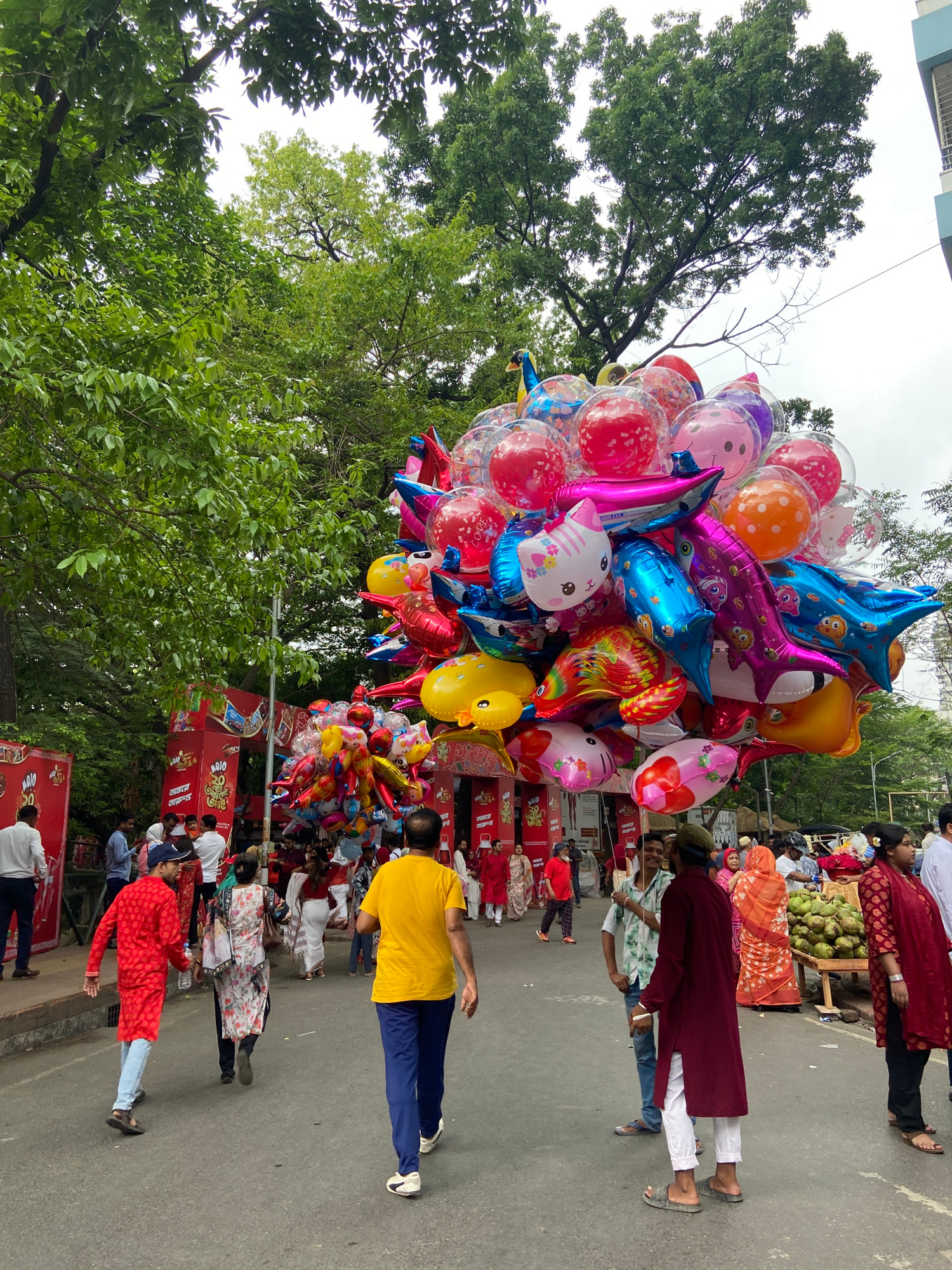 The image captures a vibrant street scene in Dhaka, Bangladesh. A dense cluster of colorful balloons, including character shapes like Hello Kitty, fish, and stars, dominates the view. The balloons app…read more