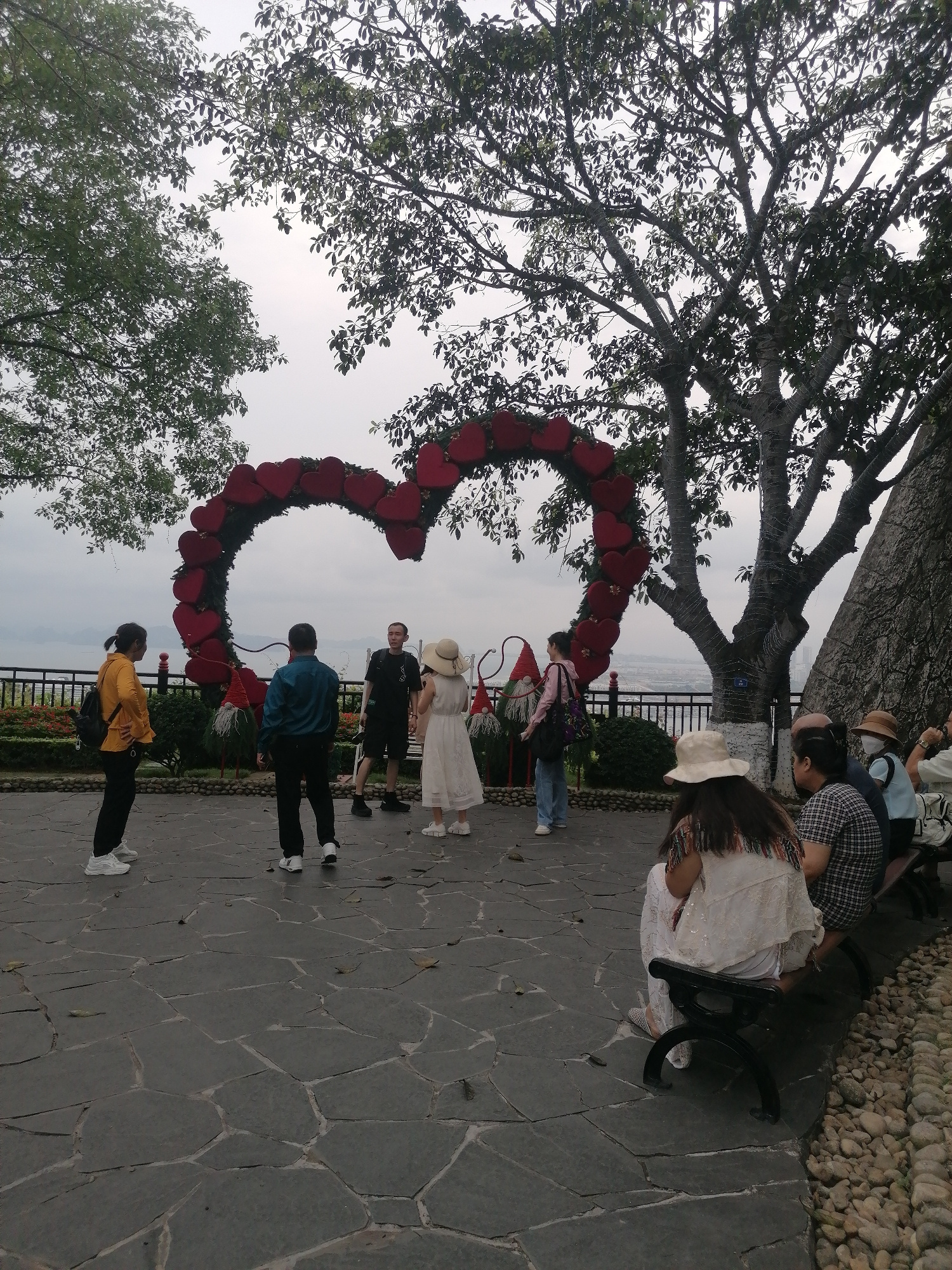 Captured in Hong Gai Ward, Vietnam, the scene unfolds outdoors on a cloudy day. A group of individuals, including sightseers, gather near a sizable heart-shaped structure adorned with red hearts. To i…read more