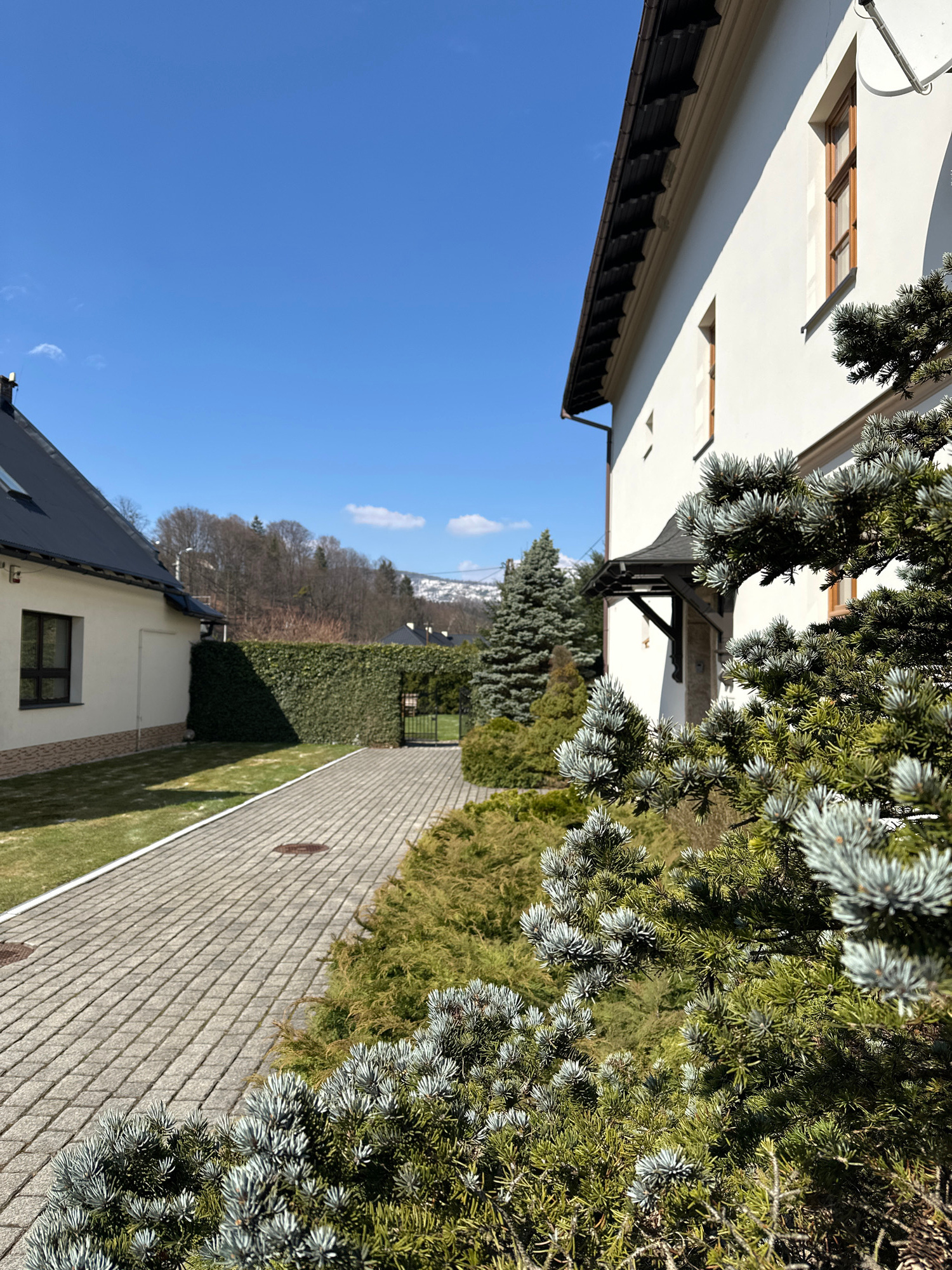 A low-angle, outdoor shot presents a pathway made of gray pavers running between two buildings and landscaping. The building on the right, closer to the camera, is a white structure with a visible dar…read more