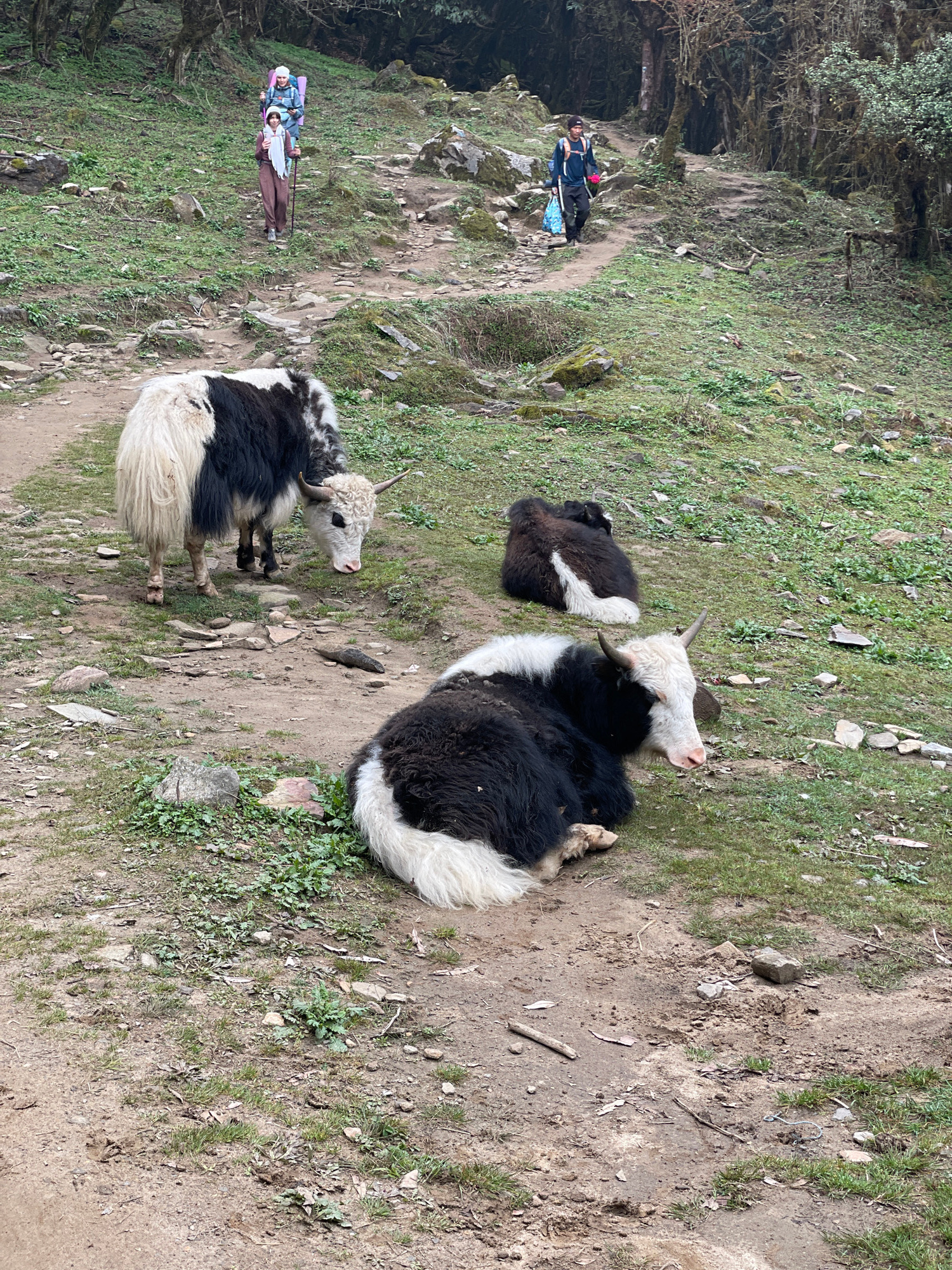 The scene depicts a dirt path in a grassy area, likely a pasture or field, near Lumre, Nepal. Three yaks, characterized by their long, shaggy black and white fur, occupy the central and foreground areβ¦read more
