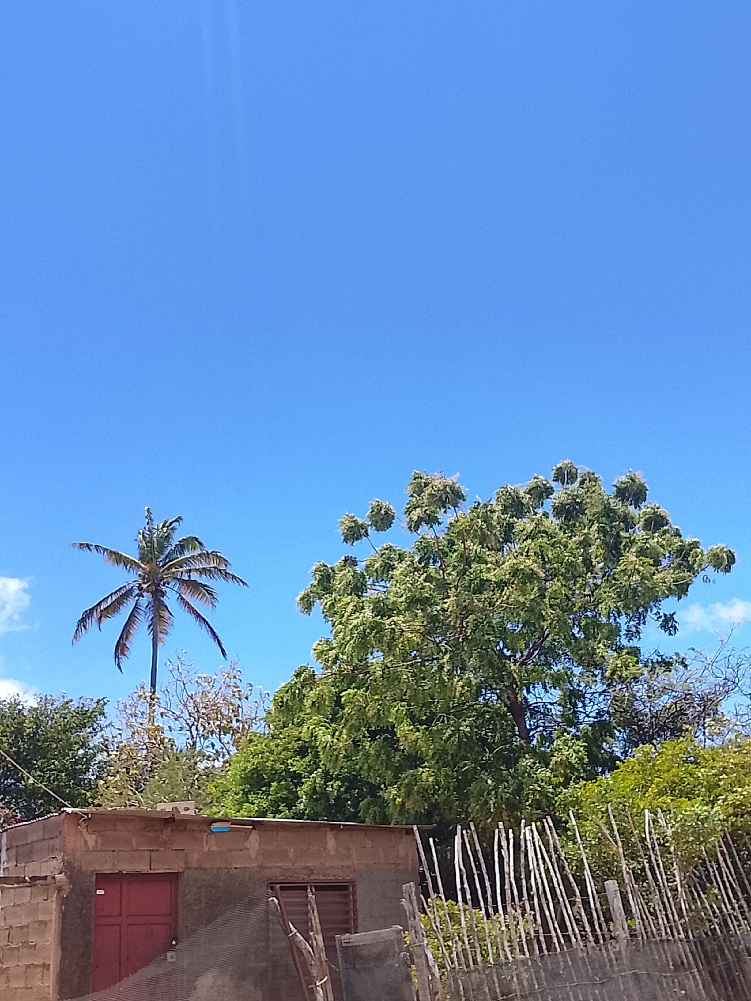 The image depicts a sunny day in Altagracia, Venezuela. The sky is a clear, bright blue with a few wisps of clouds. In the lower portion of the image, a single-story building constructed from blocks i…read more