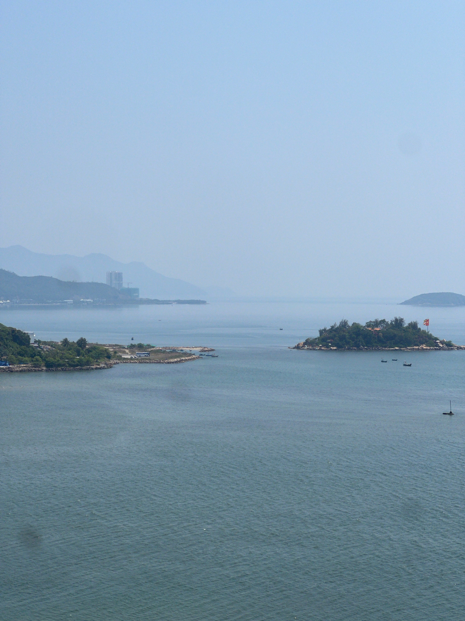 This aerial shot depicts a seascape, possibly taken near Nha Trang, Vietnam, featuring two prominent islands situated within a body of water. The sky above is clear and blue. The water is calm. The fi…read more