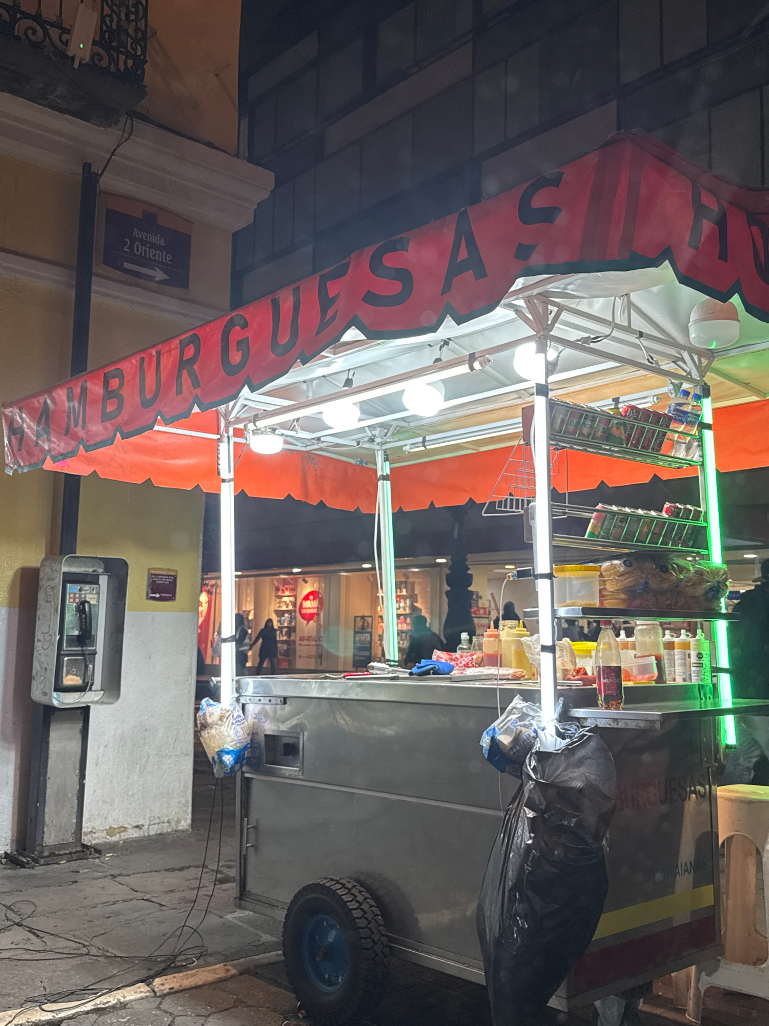 A nighttime scene in Puebla, Mexico shows a roadside "Hamburguesa" food cart. The cart, illuminated by fluorescent green lights and white bulbs, is positioned on a street near a blue street sign that…read more
