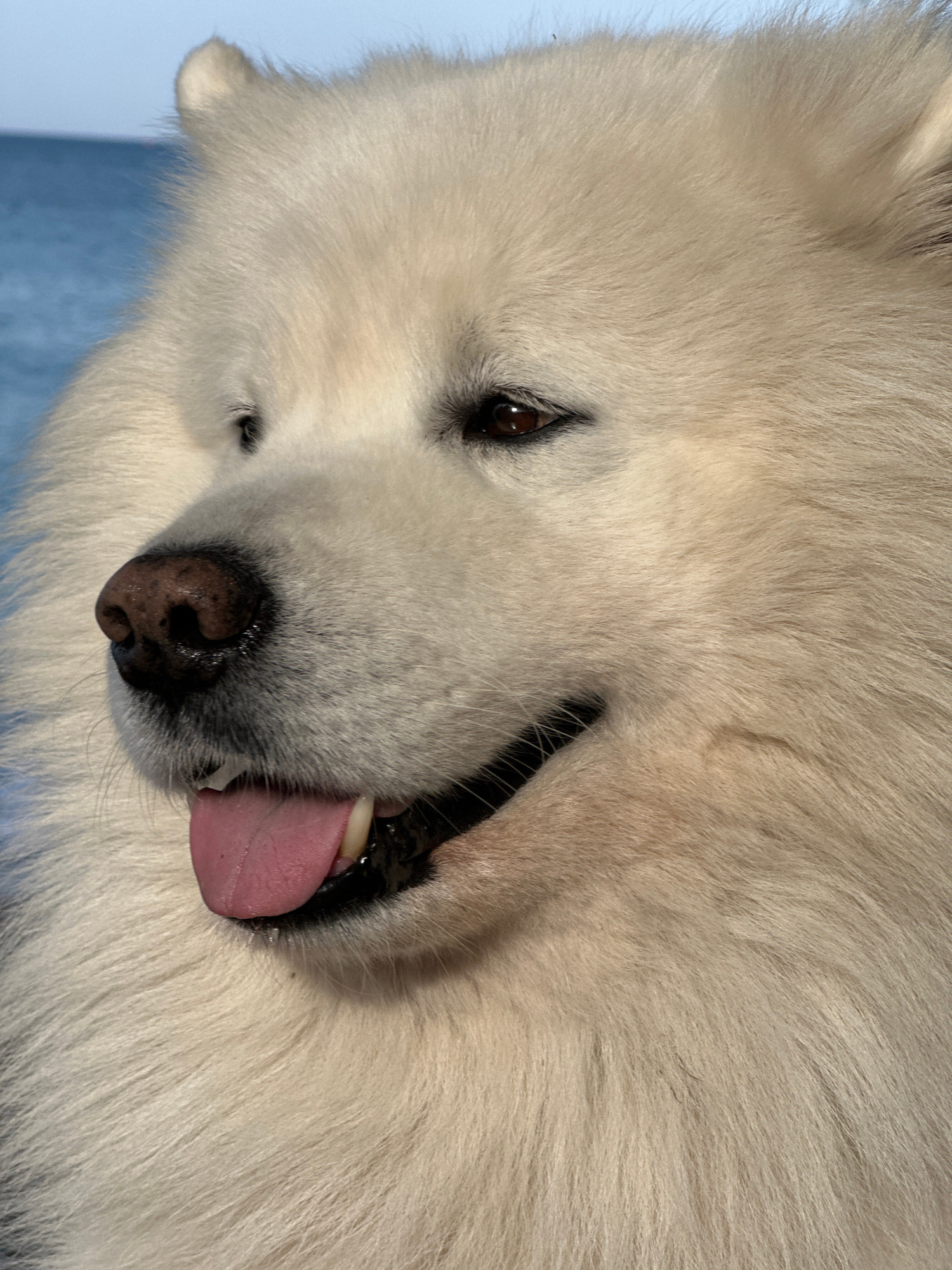 This close-up portrait, taken in Šušanj, Montenegro, features a fluffy white dog, likely a Samoyed or similar breed, its head filling the frame. The image is rotated, presenting the dog's head at an a…read more